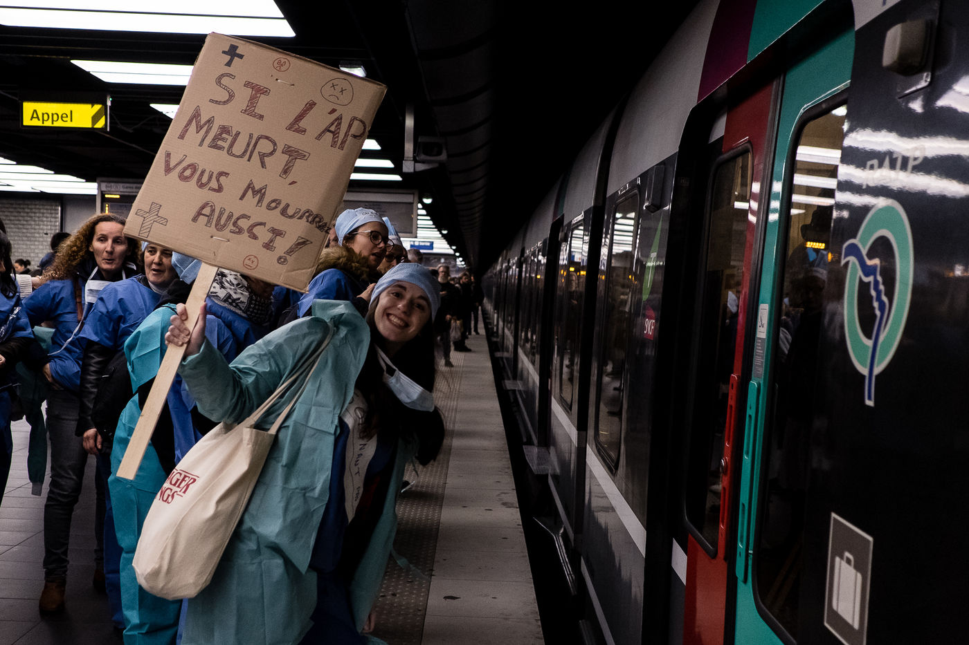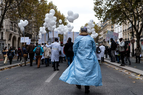 Grande mobilisation des personnels hospitaliers suite à l'appel national du Collectif Inter Hopitaux pour protester contre les réformes annoncées par la ministre de la santé Agnes Buzyn, le 14 novembre 2019 à Paris.
