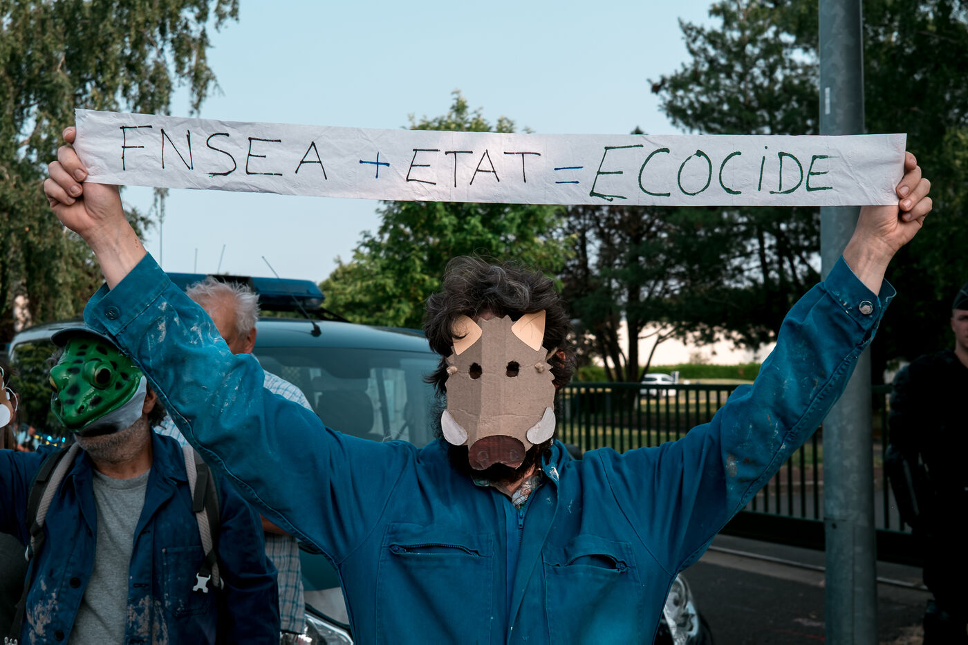 Action devant la chambre de l'agriculture de militants ecologistes en soutien aux soulevements de la Terre qui ont mis en scene la dissolution de la "co-gestion" de l'Etat et de la FNSEA. Apres avoir brandi des slogans ecrits sur du papier toilette, ils ont dissout les slogans dans des bassines d'eau puis ont jeté le papier mouillé sur la chambre de l'agriculture. Tours le 27/06/2023.
