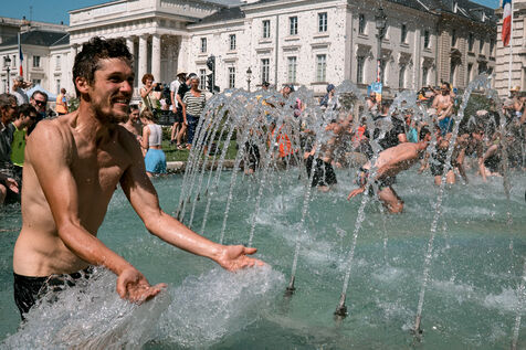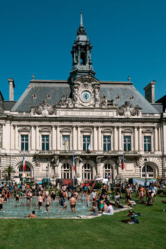 Day five of the water convoy from Sainte-Soline. The aim is to reach Orleans on Friday August 26, in front of the headquarters of the Loire-Bretagne Water Agency. For the cortege, today's stage consists of a trip from Dolus-le-Sec to Lussault-sur-Loire, passing through Tours and then to the ile de la Metairie in La Ville-aux-Dames for a picnic and speeches about the Loire. In Tours, part of the cortege bathed in the fountains of Place Jean Jaures. Speeches were made in front of the courthouse in support of the five Derniere Renovation activists on trial for coloring the prefecture orange with water-based paint. Tours, 21/08/2023. Photography by Sebastien PONS / Hans Lucas