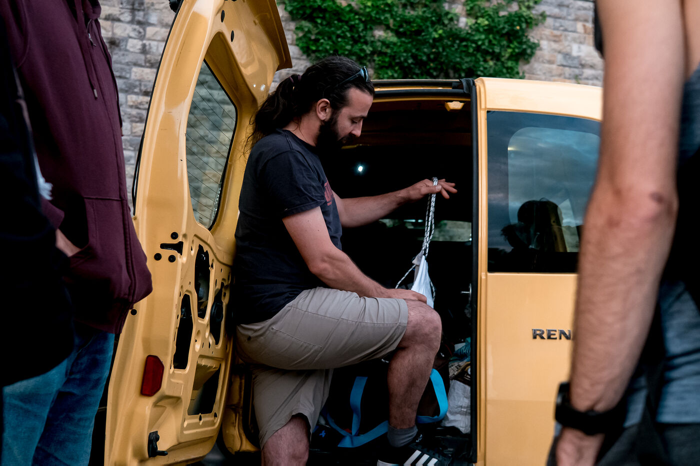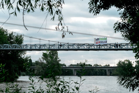 Climate activists hang a Front Ecologique Social Populaire banner on the Pont de Fil, in support of the Nouveau Front Populaire. The clash was broken up by the municipal police, who identified the activists. They also identified me for taking their photo. Tours, the 28th of june 2024. Photograph by Sebastien Pons / Hans Lucas