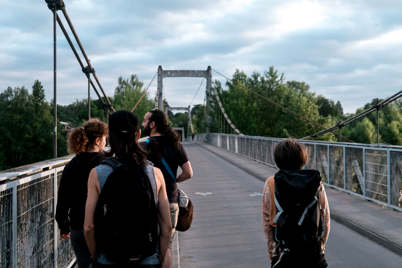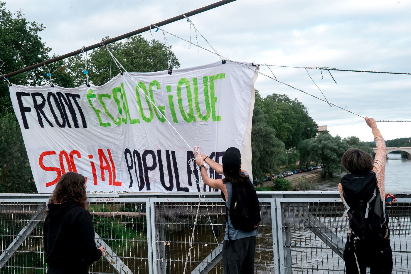 Accrochage d'une banniere Front Ecologique Social Populaire par des activistes climat, sur le pont de fil, en soutien au Nouveau Front Populaire. L'accrochage a ete interrompu par la police municipale qui a releve les identites des activistes. Ils ont aussi releve mon identite pour les avoir pris en photo.. Tours 28/06/2024. Photographie par Sebastien PONS / Hans Lucas
