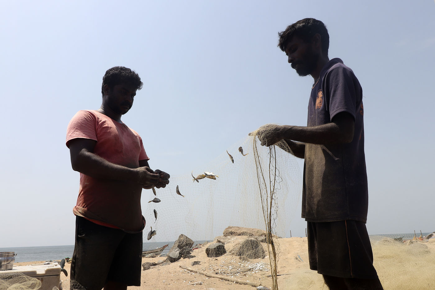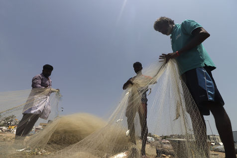 India, Chennai, 2021-05-29. Fishermen collect fishes from an early morning catch during the complete lockdown as a preventive measure against the COVID-19 coronavirus, in Chennai.