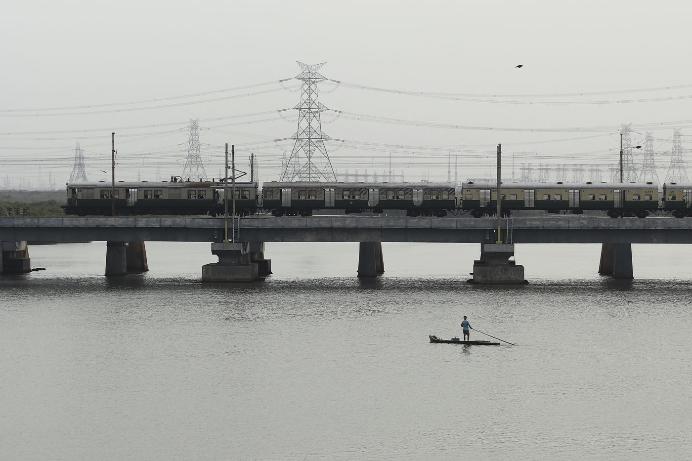 India, Chennai, 2021-06-24. Indian fishermen are seen fishing in the evening near the Ennore creek on the outskirts of Chennai.