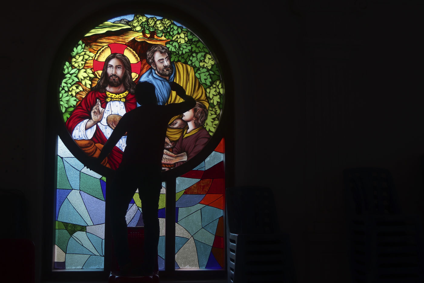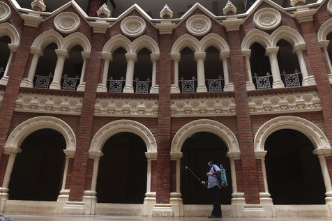Inde, Chennai, 2021-06-27. Les employes nettoient un centre commercial avant sa reouverture a Chennai, le gouvernement de l Etat ayant autorise l ouverture des centres commerciaux et des espaces commerciaux a partir de demain a Chennai. Photographie de Sri Loganathan Velmurugan / Hans Lucas.