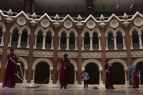 India, Chennai, 2021-06-27. Employees clean a shopping mall ahead of its re-opening in Chennai as the state government allowed the malls and shopping spaces to open from tomorrow in Chennai. Photograph by Sri Loganathan Velmurugan / Hans Lucas.