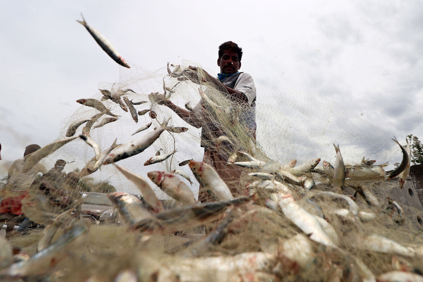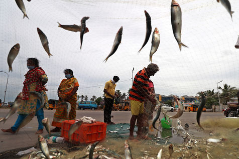 Inde, Chennai, 2021-07-09. Des pecheurs indiens ramassent du poisson d une prise du matin a Chennai. Photographie de Sri Loganathan Velmurugan / Hans Lucas.