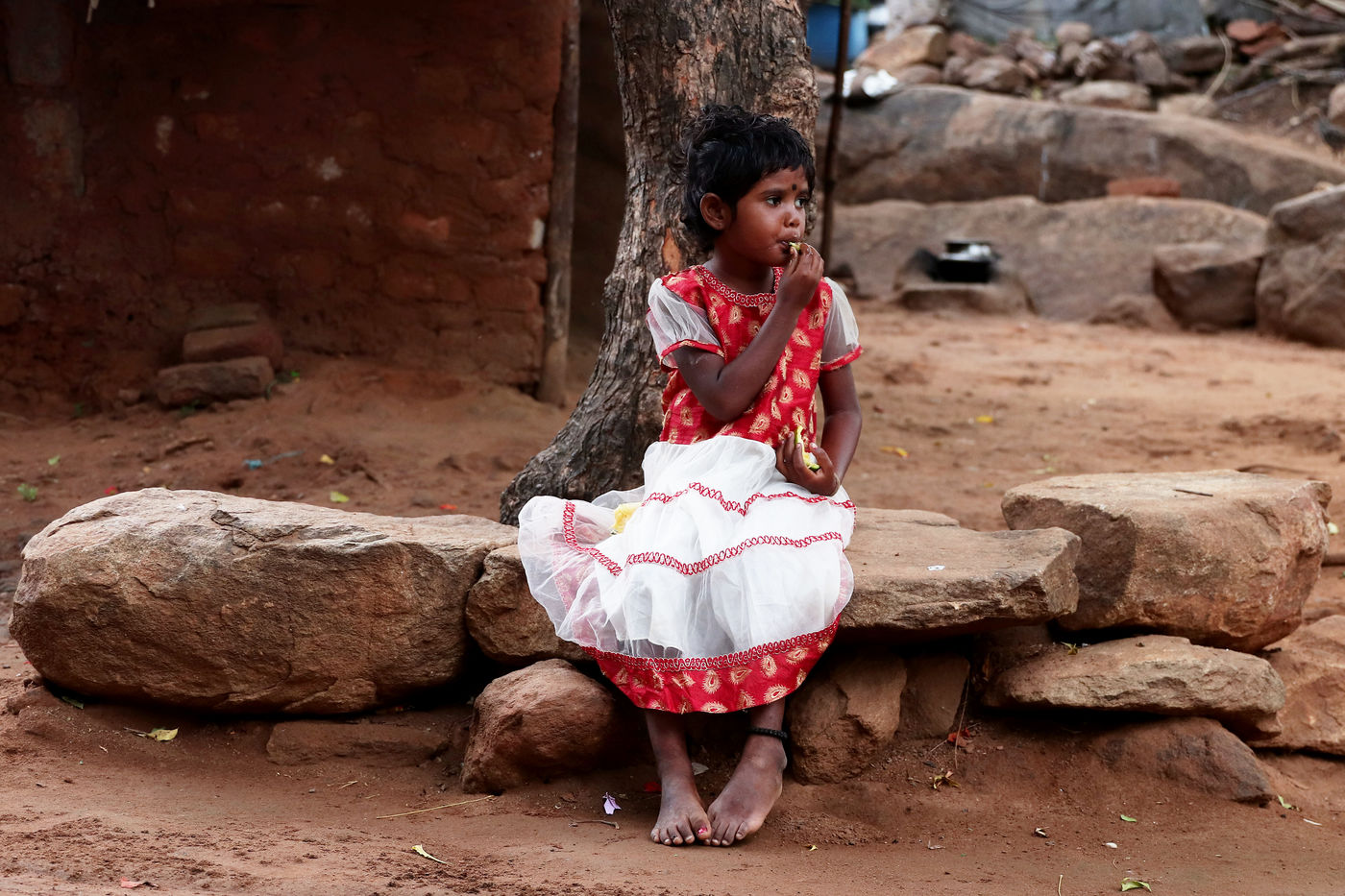 India, Chennai, 2021-07-13. Tribal children engaged with their regular activities at Hope Village, a settlement for Tribal Irular Community. A Photo essay on old tribal Irular community. The traditional indigenous Irular Community dwells in Pazhaveli, a tiny hamlet near Chengalpattu, some 80 kilometres from Chennai. The tribes live in homes made of bricks and straws on a hillside. They support themselves by selling firewood, caring for agriculture, and fishing. They do not have land ownership despite having lived there for more than a century. Photograph by Sri Loganathan Velmurugan / Hans Lucas.