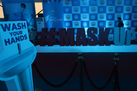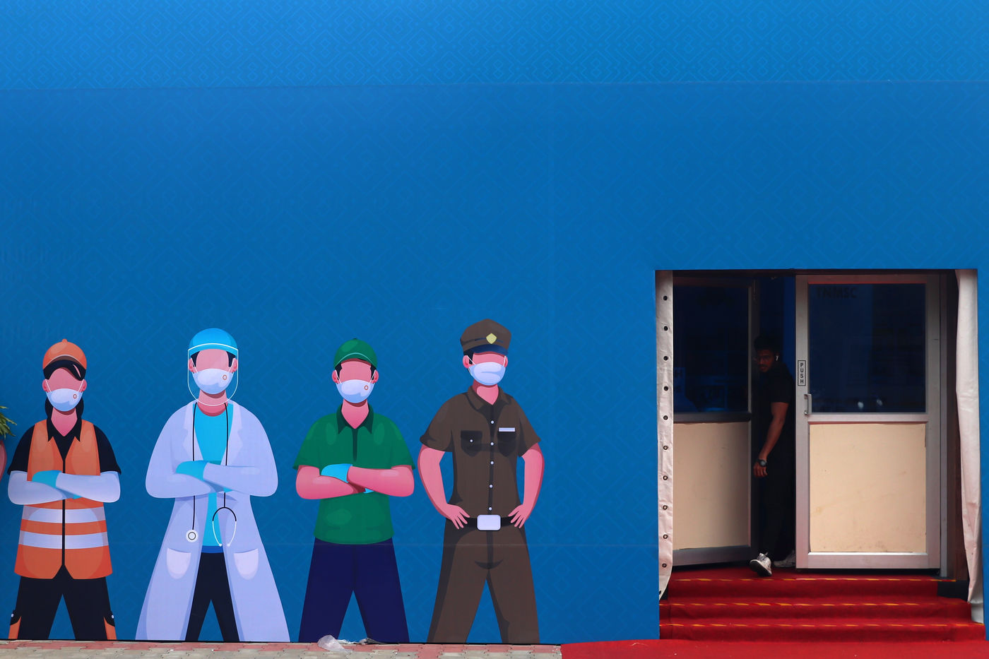 India, Chennai, 2021-07-30. The display materials of a Covid-19 coronavirus awareness exhibition is being set up by employees in Chennai. Photograph by Sri Loganathan Velmurugan / Hans Lucas.