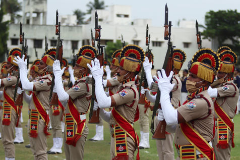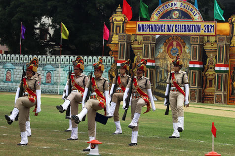 India, Chennai, 2021-08-15. Cadets of the Railway Protection Force (RPF) take part in a parade during the celebrations of India's 75th Independence Day in Chennai. India celebrates its anniversary of Independence from British colonial rule on August 15. Photograph by Sri Loganathan Velmurugan / Hans Lucas.