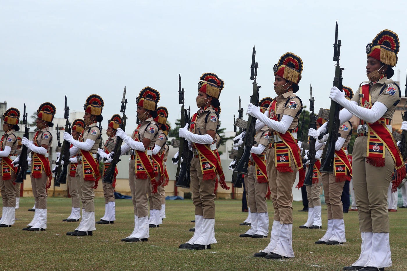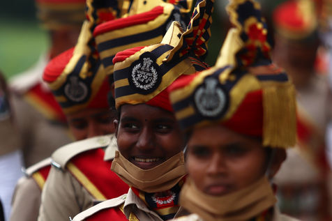 Inde, Chennai, 2021-08-15. Les cadets de la Force de protection des chemins de fer (FPR) participent a un defile lors des celebrations du 75e jour de l independance de l Inde a Chennai. L Inde celebre son anniversaire de l independance de la domination coloniale britannique le 15 aout. Photographie de Sri Loganathan Velmurugan / Hans Lucas.