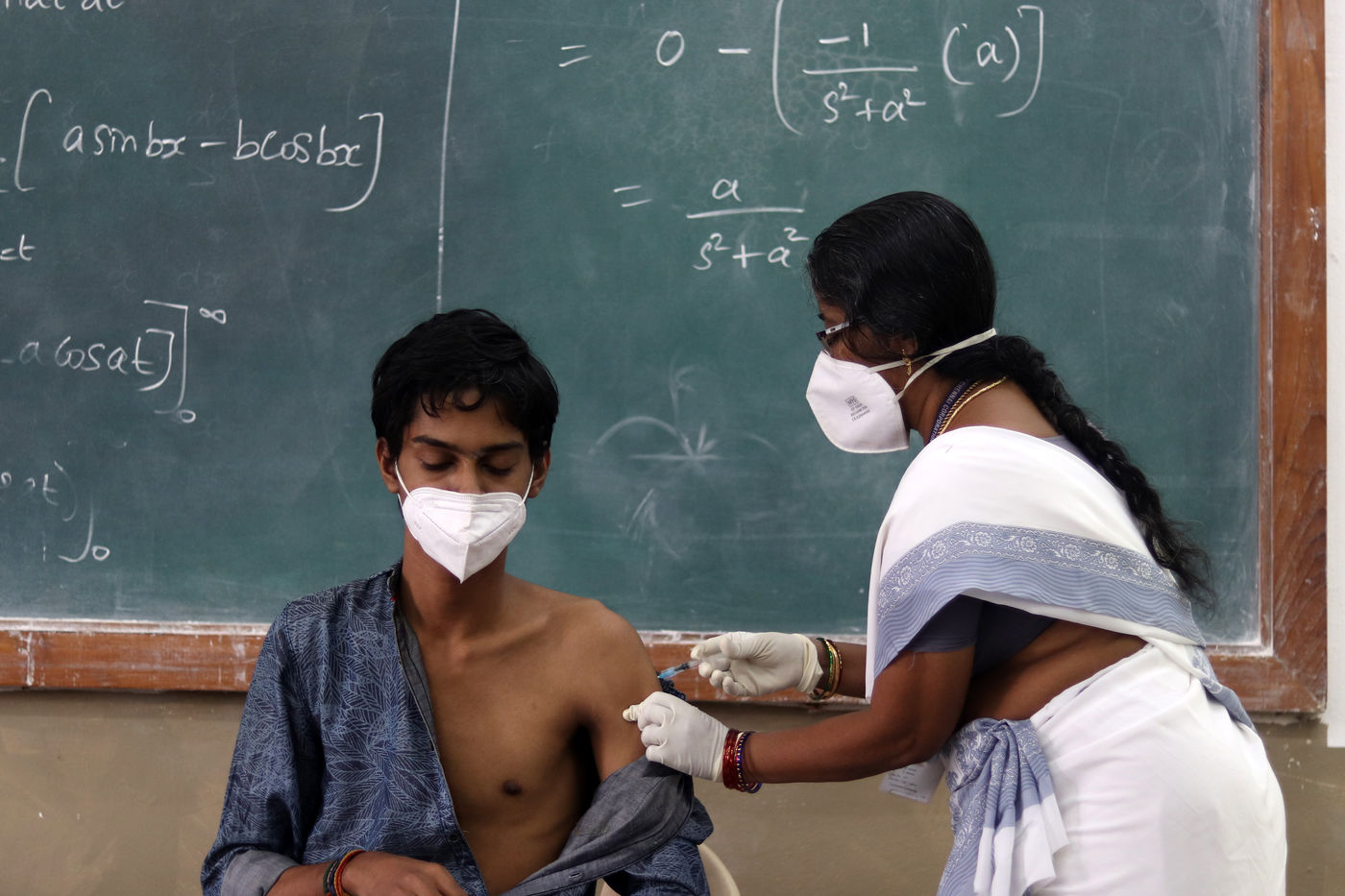 India, Chennai, 2021-09-06. A health worker inoculates a college student with a dose of Covishield, a Covid19 coronavirus vaccine during a vaccination camp on a college campus in Chennai. Following a slight decrease in COVID-19 cases, the Tamil Nadu State Government has allowed schools and colleges to reopen with certain COVID-19 guidelines. Photograph by Sri Loganathan Velmurugan / Hans Lucas.