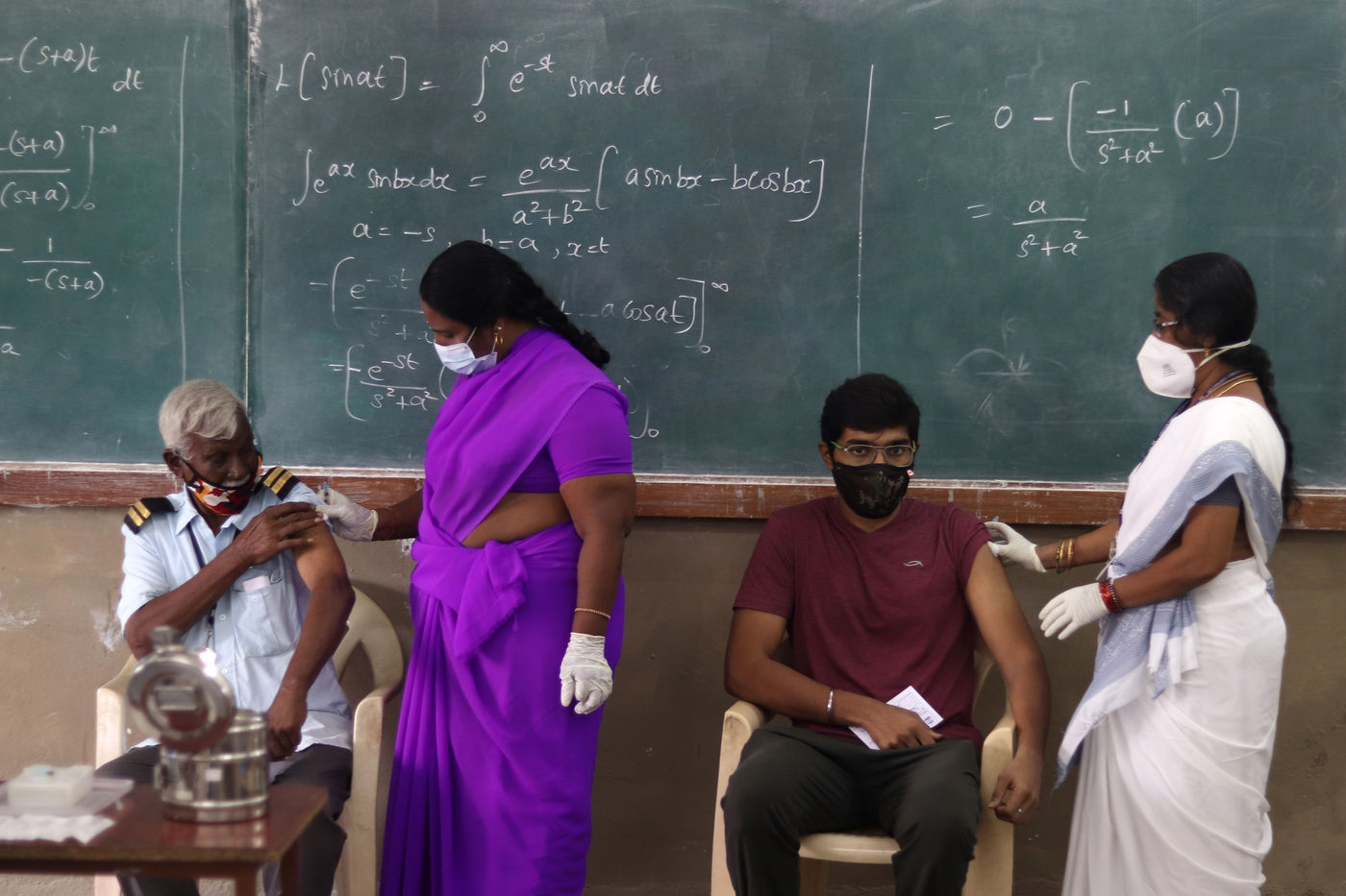 Inde, Chennai, 2021-09-06. Un agent de sante inocule a un etudiant une dose de Covishield, un vaccin contre le coronavirus Covid19 lors d un camp de vaccination sur un campus universitaire a Chennai. Suite a une legere diminution des cas de COVID-19, le gouvernement de l Etat du Tamil Nadu a autorise la reouverture des ecoles et des colleges avec certaines directives COVID-19. Photographie de Sri Loganathan Velmurugan / Hans Lucas.