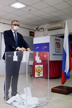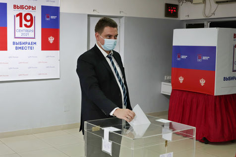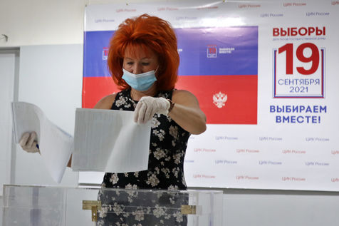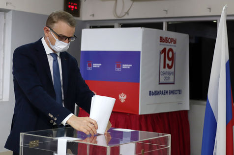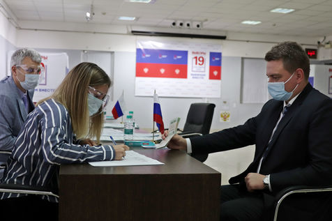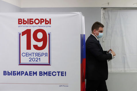 India, Chennai, 2021-09-19. A Russian national wearing a protective face mask cast his ballot at a polling station set up at the Russian Center for Science and Arts in Chennai during the last day of the three-day Russian parliamentary elections. Photograph by Sri Loganathan Velmurugan / Hans Lucas.