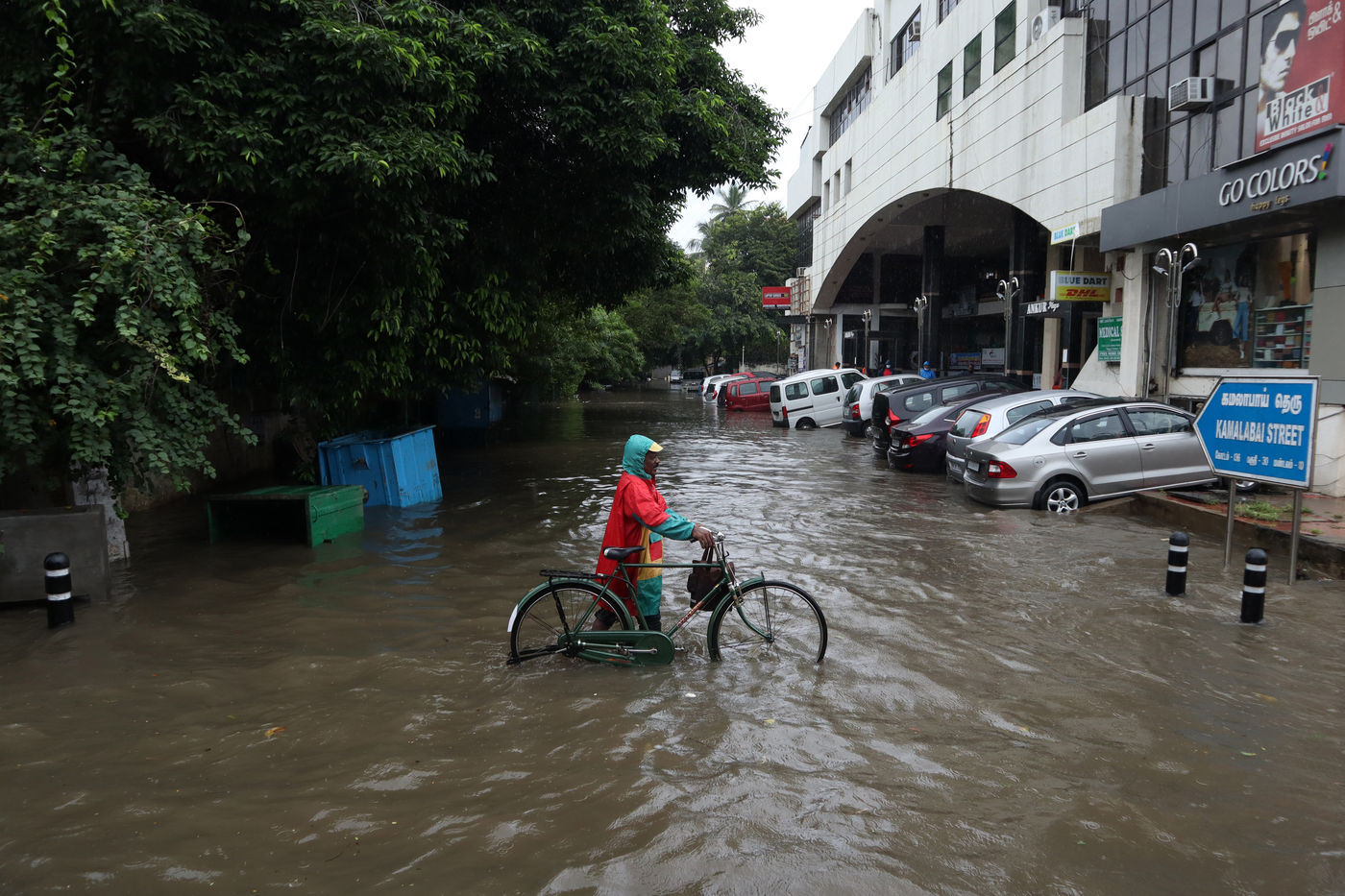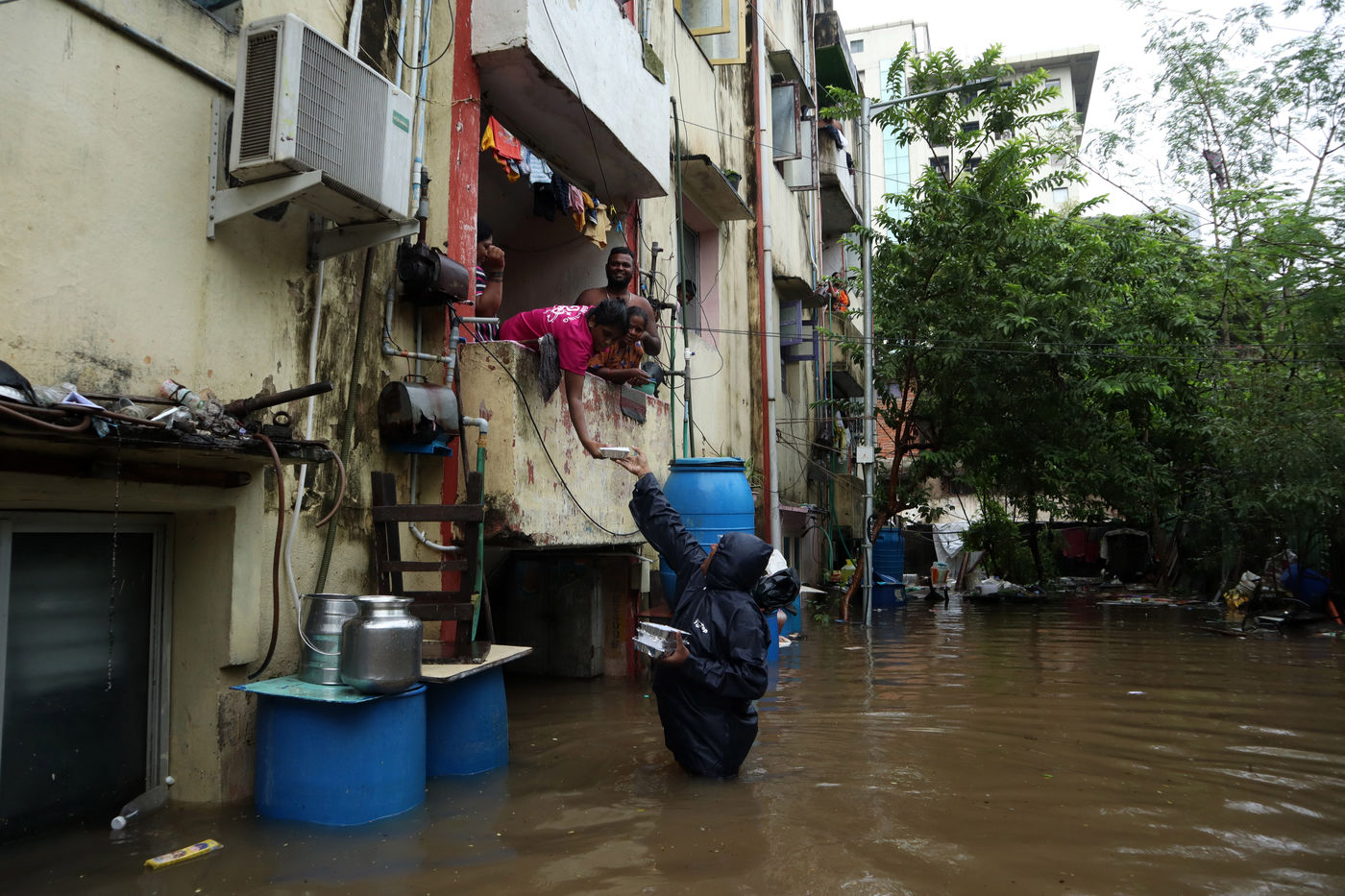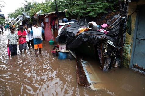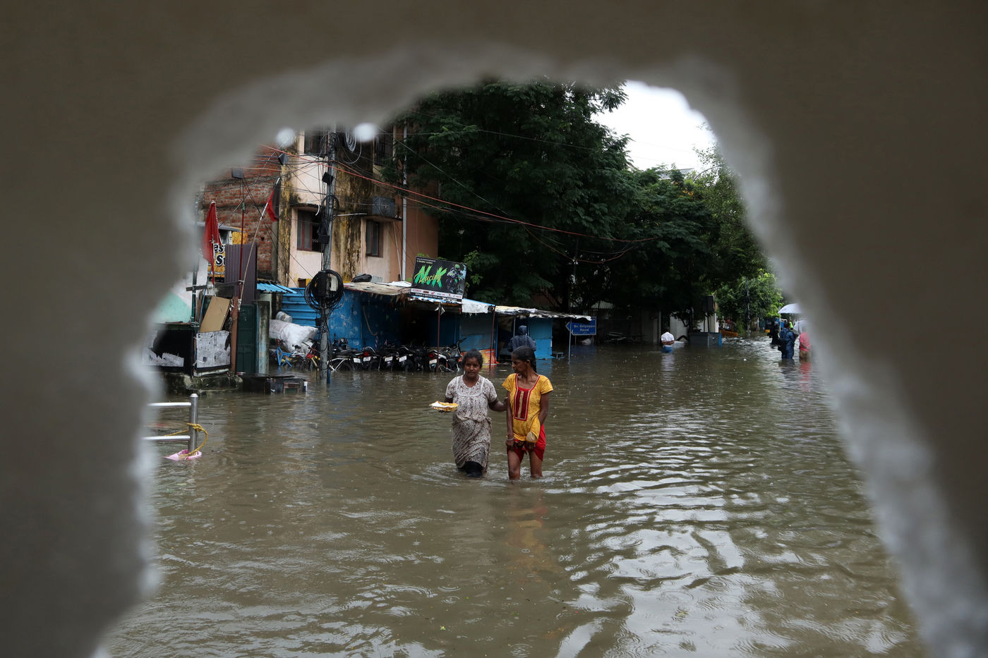 India, Chennai, 2021-11-07. Residents of a slum are seen walking in the street flooded with water due to the heavy rains in Chennai. The India Meteorological Department (IMD) issued a red alert after torrential rains from the North-East monsoon triggered flooding in numerous sections of Chennai as a low-pressure region formed over the SouthEast Bay of Bengal. Photograph by Sri Loganathan Velmurugan / Hans Lucas.