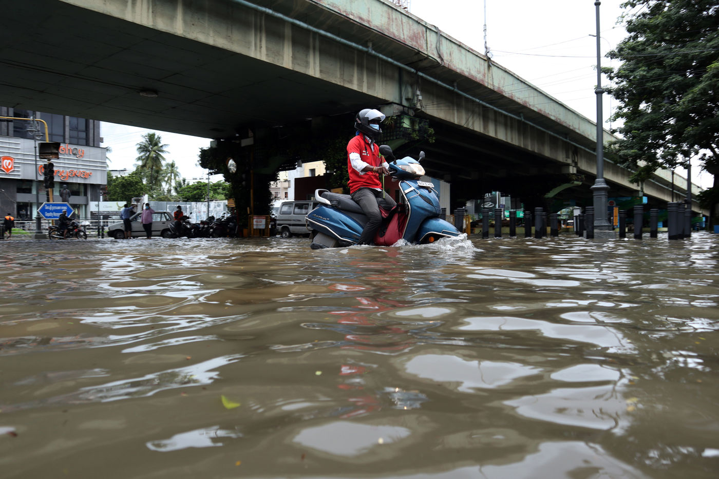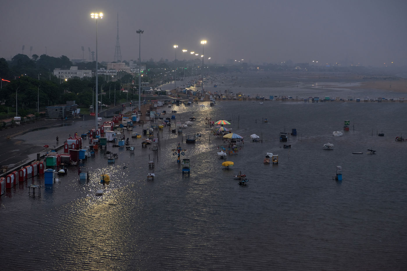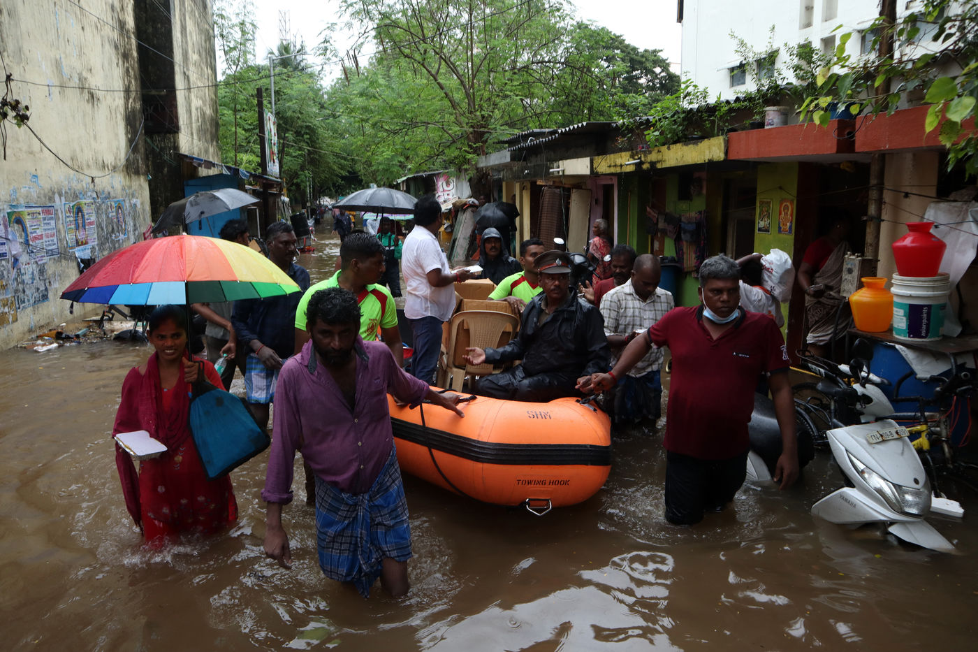 India, Chennai, 2021-11-07. Residents of a slum are seen walking in the street flooded with water due to the heavy rains in Chennai. The India Meteorological Department (IMD) issued a red alert after torrential rains from the North-East monsoon triggered flooding in numerous sections of Chennai as a low-pressure region formed over the SouthEast Bay of Bengal. Photograph by Sri Loganathan Velmurugan / Hans Lucas.