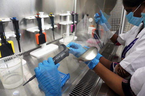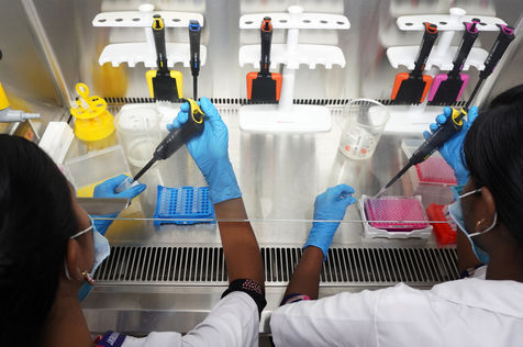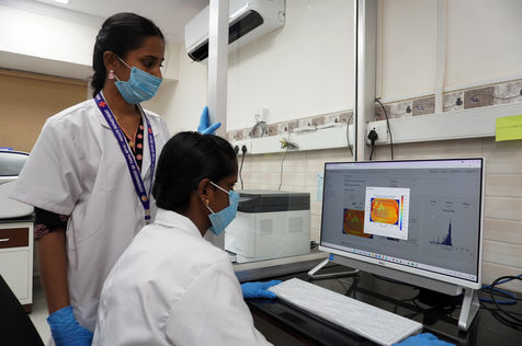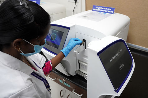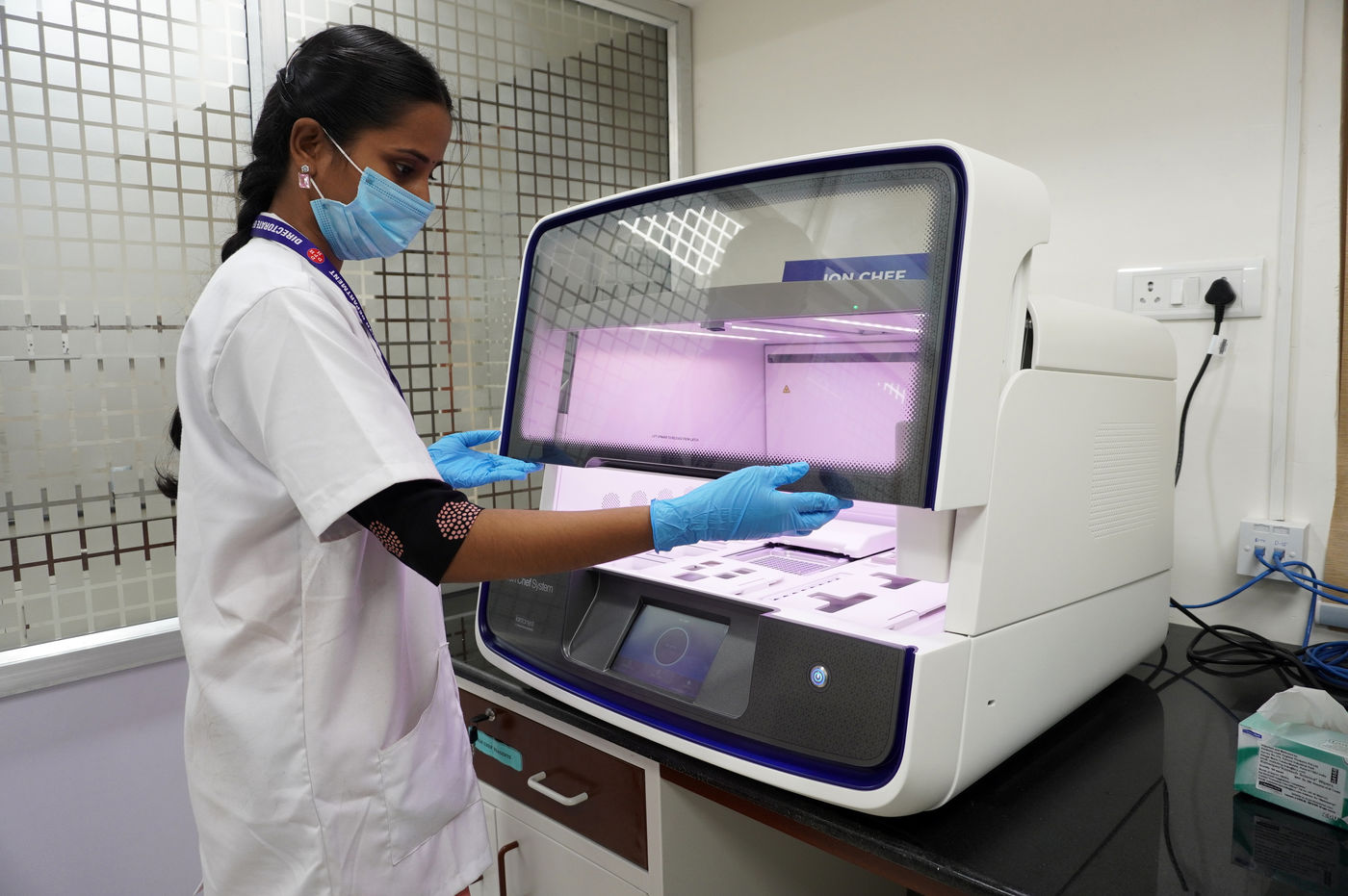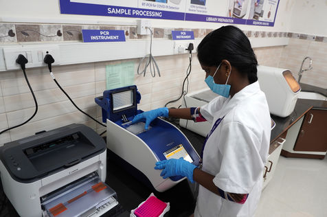 India, Chennai, 2021-11-30. A medical employee works in a sequencing laboratory at the Directorate of Medical and Rural Health Services in Chennai. In the laboratory, the samples are systematically examined for various coronavirus mutations. The aim is to rapidly identify mutations that pose a particular risk in terms of transmissibility, disease severity, and vaccine potential. The WHO (World Health Organisation) classified the new variant of Concern (VOC) Omicron strain as global 'high risk'. Photograph by Sri Loganathan Velmurugan / Hans Lucas.