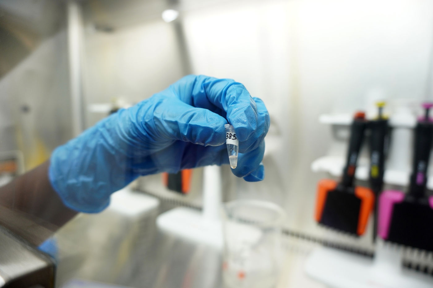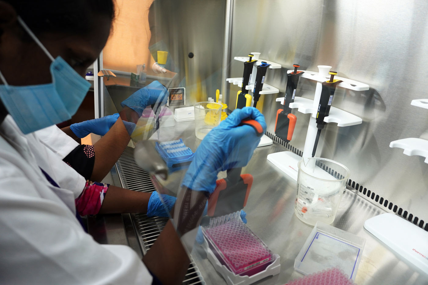Inde, Chennai, 2021-11-30. Un employe medical travaille dans un laboratoire de sequencage a la Direction des services de sante medicaux et ruraux a Chennai. En laboratoire, les prelevements sont systematiquement examines a la recherche de diverses mutations du coronavirus. L objectif est d identifier rapidement les mutations qui presentent un risque particulier en termes de transmissibilite, de gravite de la maladie et de potentiel vaccinal. L OMS (Organisation mondiale de la sante) a classe la nouvelle variante de la souche Concern (VOC) Omicron comme « a haut risque ». Photographie de Sri Loganathan Velmurugan / Hans Lucas.