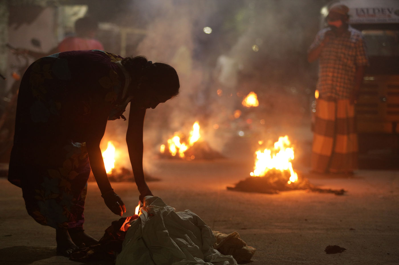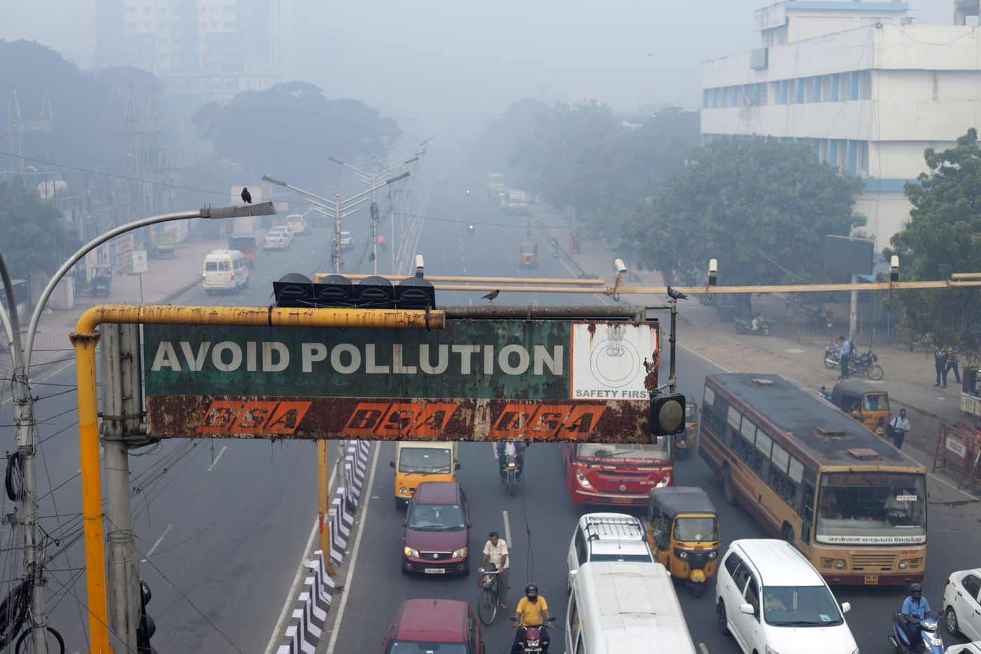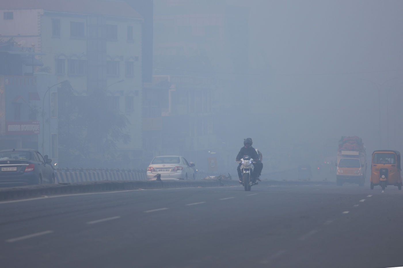 India, Chennai, 2022-01-13. Commuters travel amid dense smoggy conditions caused by the Bhogi Bonfire in Chennai. Bhogi is the first day of the four-day Makara Sankranti festival. On Bhogi, people discard old and derelict things and concentrate on new things causing change or transformation. People light bonfires with logs of wood, old clothes, and wooden furniture at home that are no longer useful. Photograph by Sri Loganathan Velmurugan / Hans Lucas.