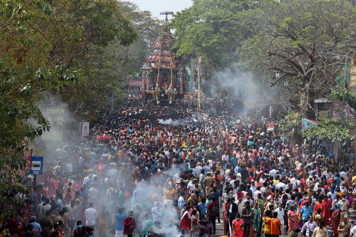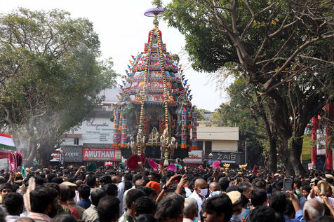 India, Chennai, 2022-03-15. Hindu devotees pull a chariot decorated with flowers and statues carrying a diety of Hindu God Shiva during during an annual temple car festival procession in Chennai. Photograph by Sri Loganathan Velmurugan / Hans Lucas.