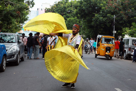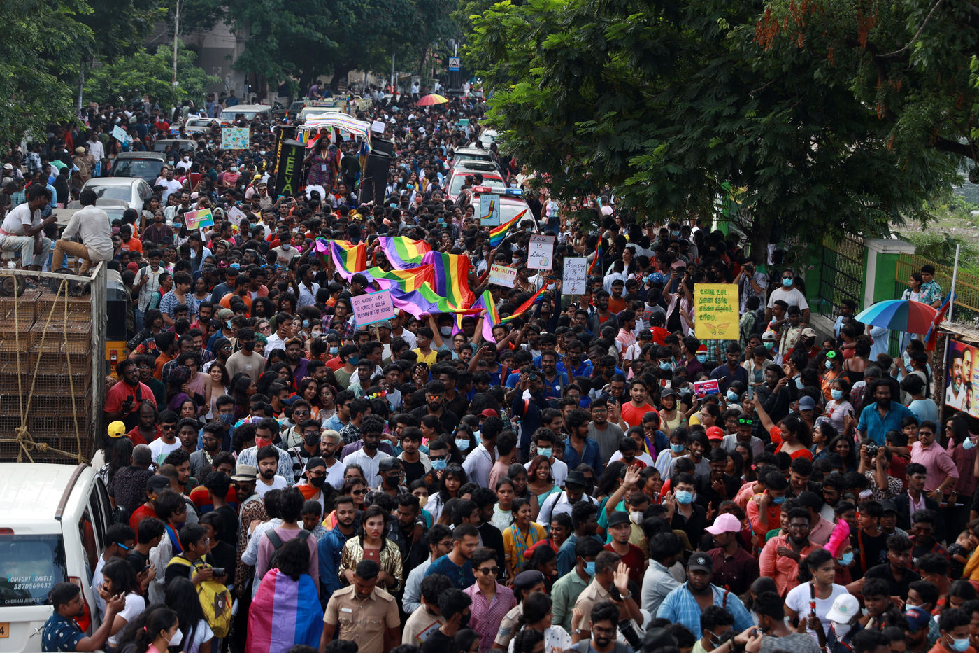India, Chennai, 2022-06-26. Activists and supporters of LGBTQ community walk a pride parade marking the Pride month in Chennai. Pride month begins on June 1st and goes on till June 30th. Pride Month commemorates years of struggle for civil rights and the ongoing pursuit of equal justice under the law for the lesbian, gay, bisexual, transgender, and queer community, as well as the accomplishments of LGBTQAI+ individuals. Photograph by Sri Loganathan Velmurugan / Hans Lucas.
