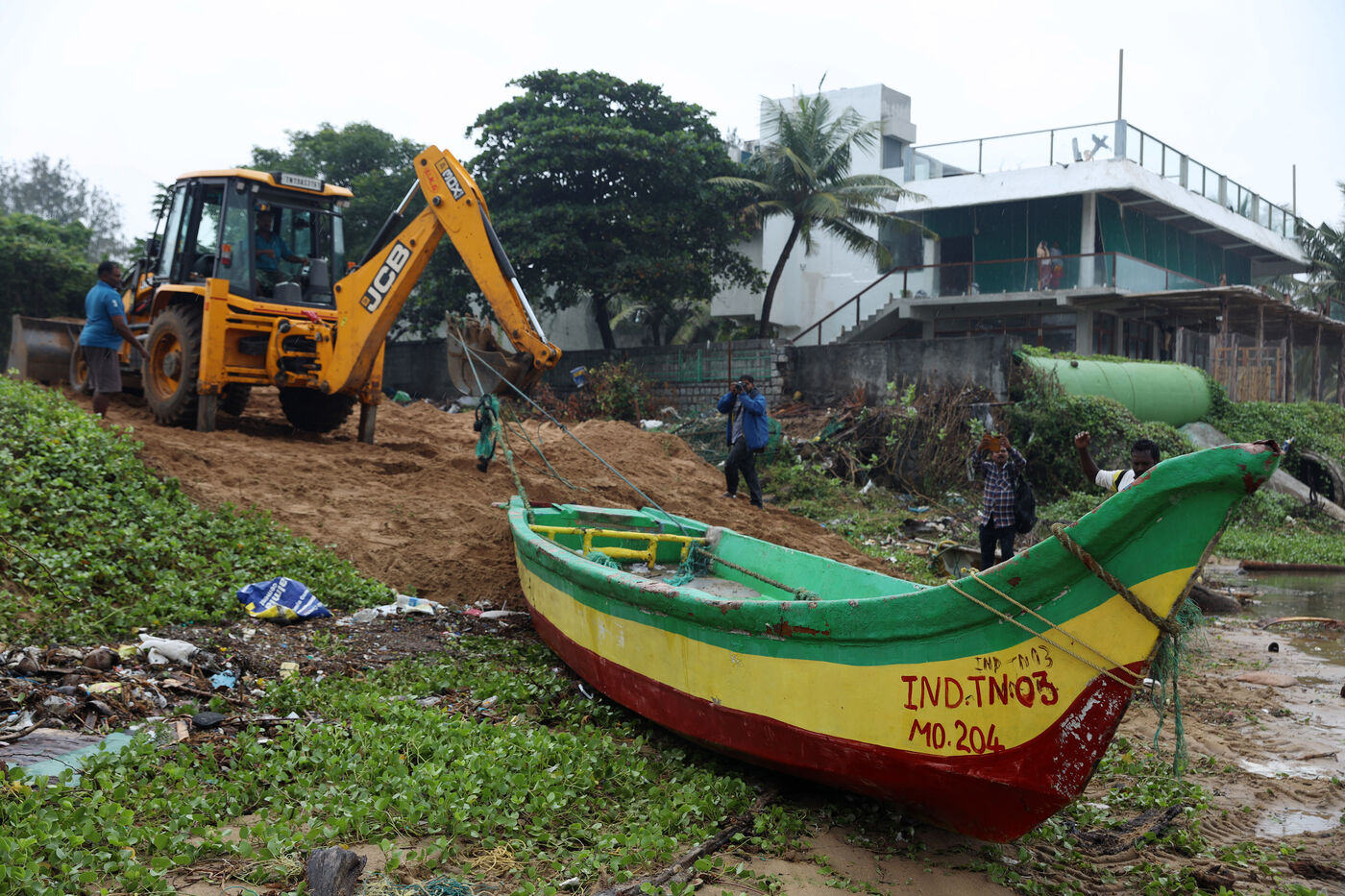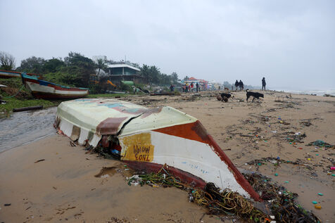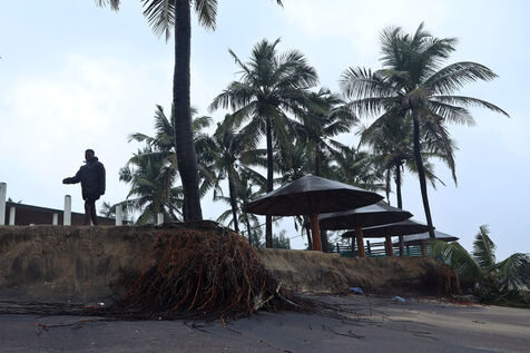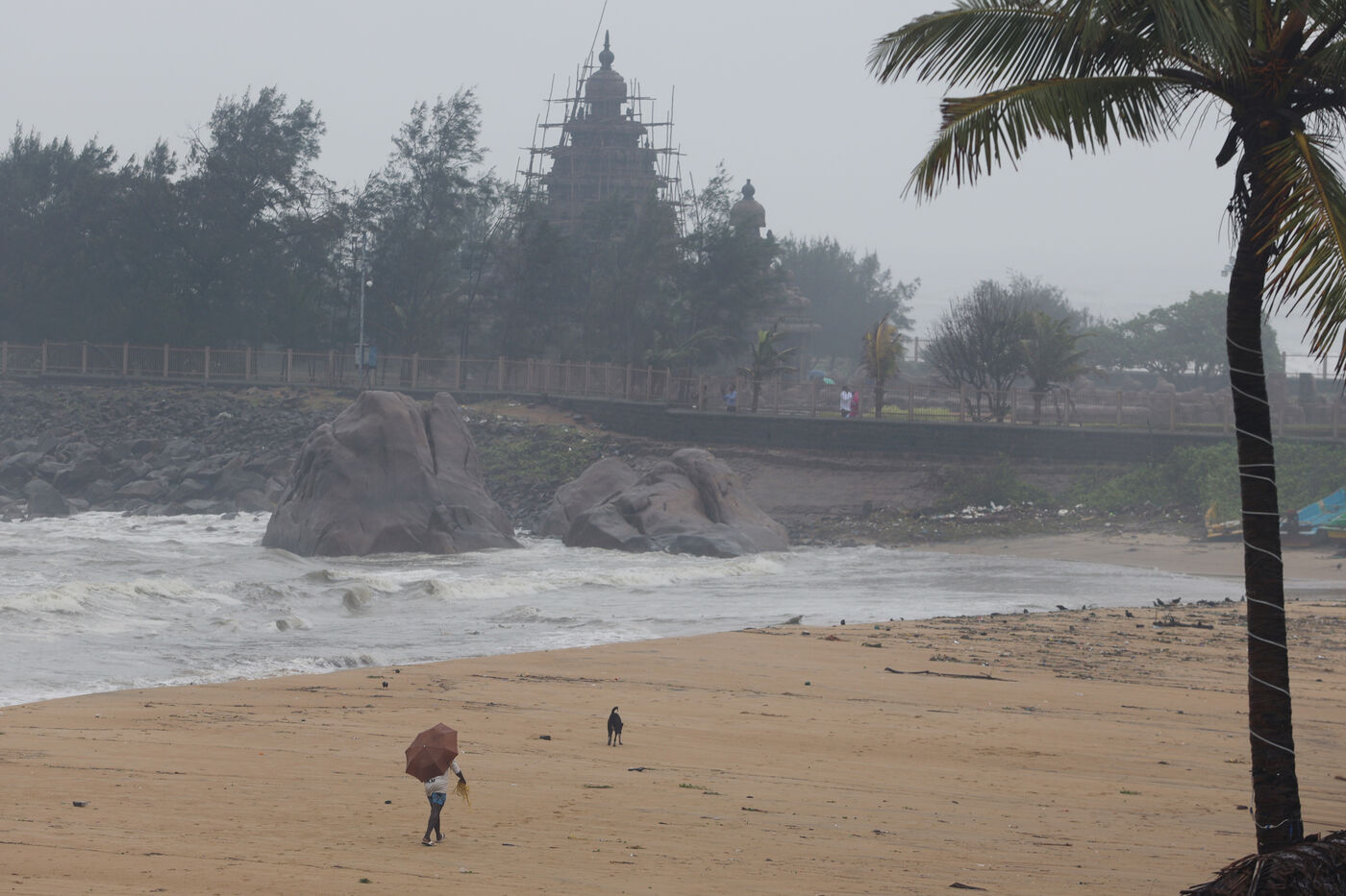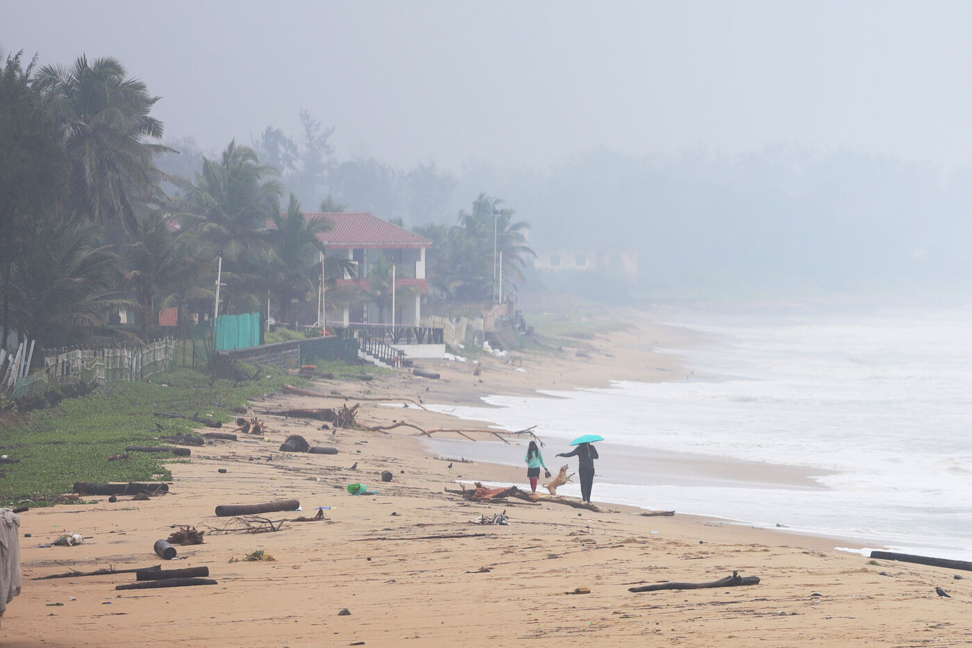 India, Chennai, 2022-12-09. A man seen walking near the uprooted palm trees due to the high tides near the Mahabalipuram beach as Cyclone Mandous is expected to make landfall, in Mahabalipuram, near Chennai. Photograph by Sri Loganathan Velmurugan / Hans Lucas.