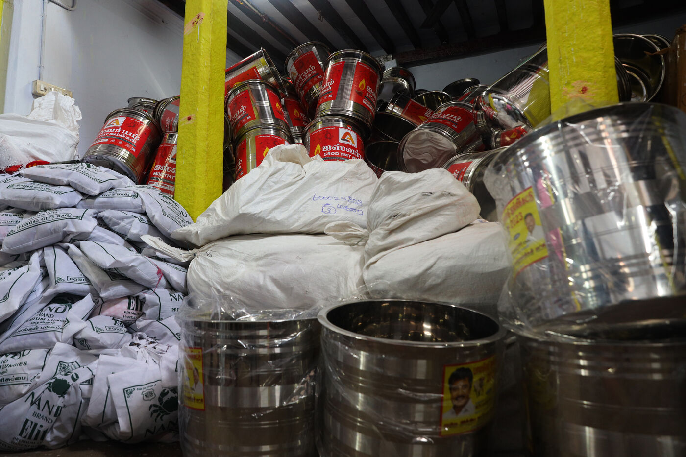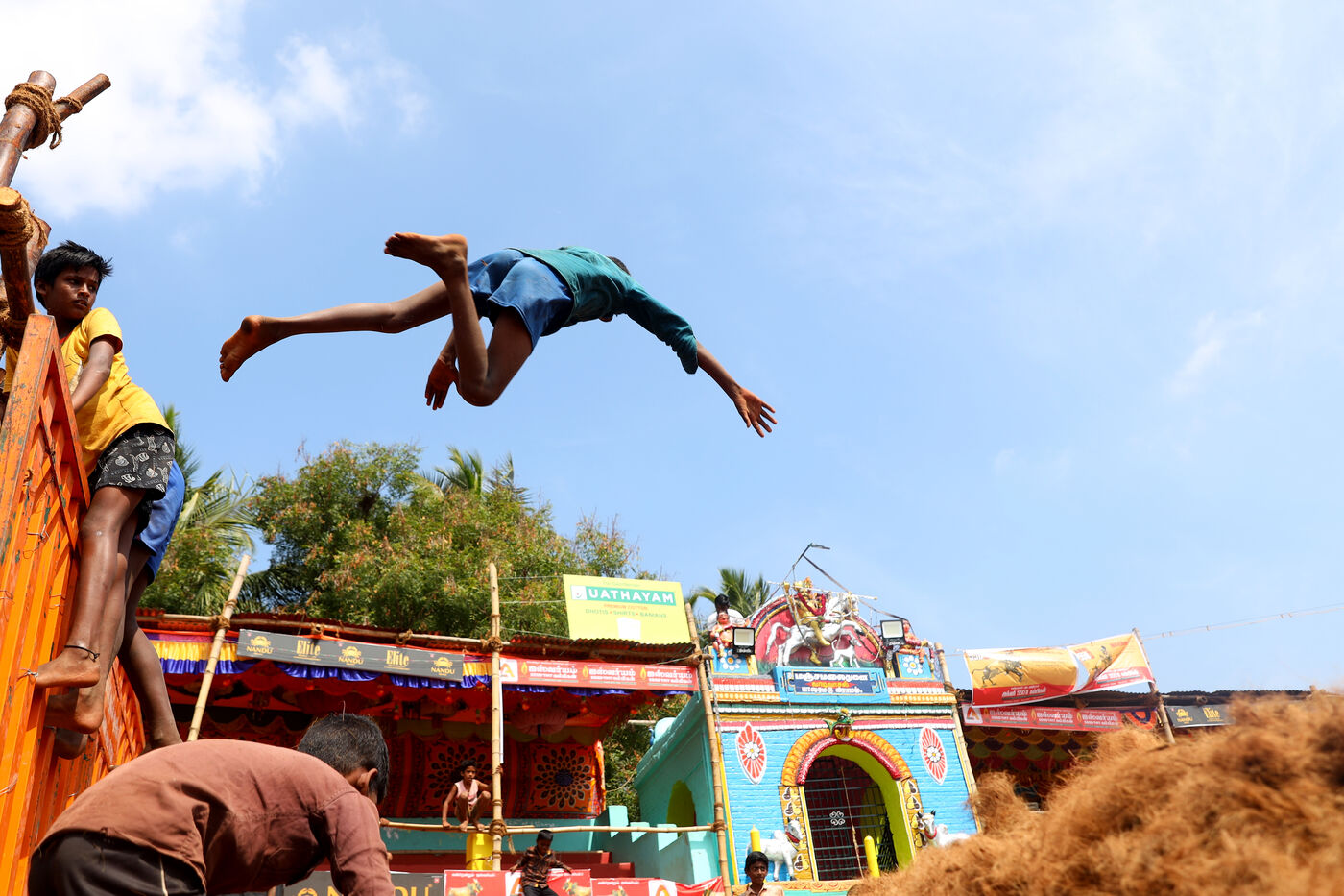 India, Madurai, 2023-14-01. Children play beside the Vadivasal established ahead of the traditional bull taming festival "Jallikkattu" in the village of Palemedu on the outskirts of Madurai in Tamilnadu. Jallikattu is a traditional Tamil bull taming sport that takes place during Pongal, a harvest festival in the Indian state of Tamil Nadu. Photograph by Sri Loganathan Velmurugan / Hans Lucas.