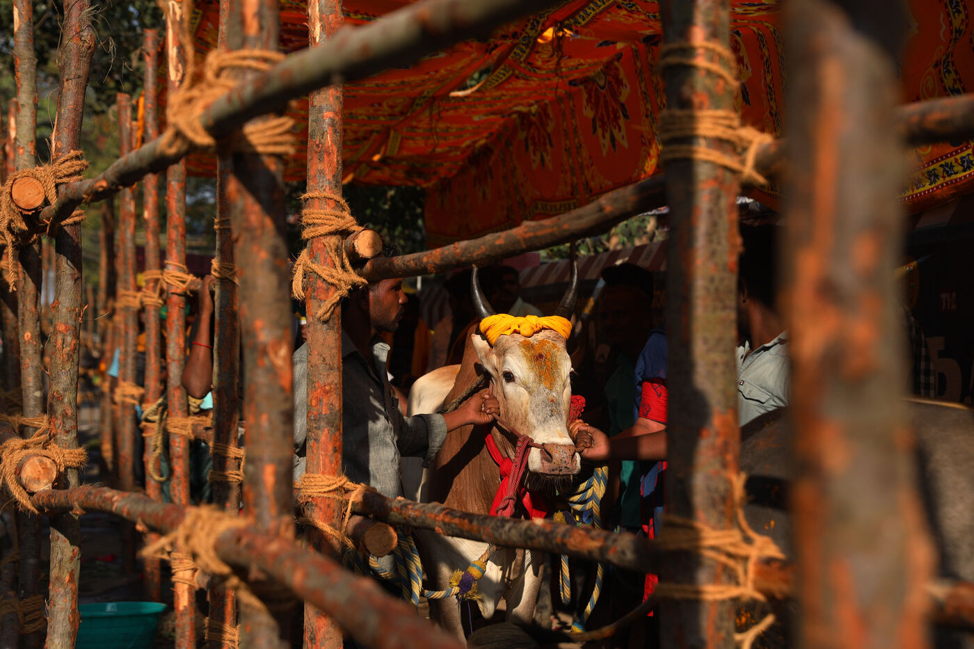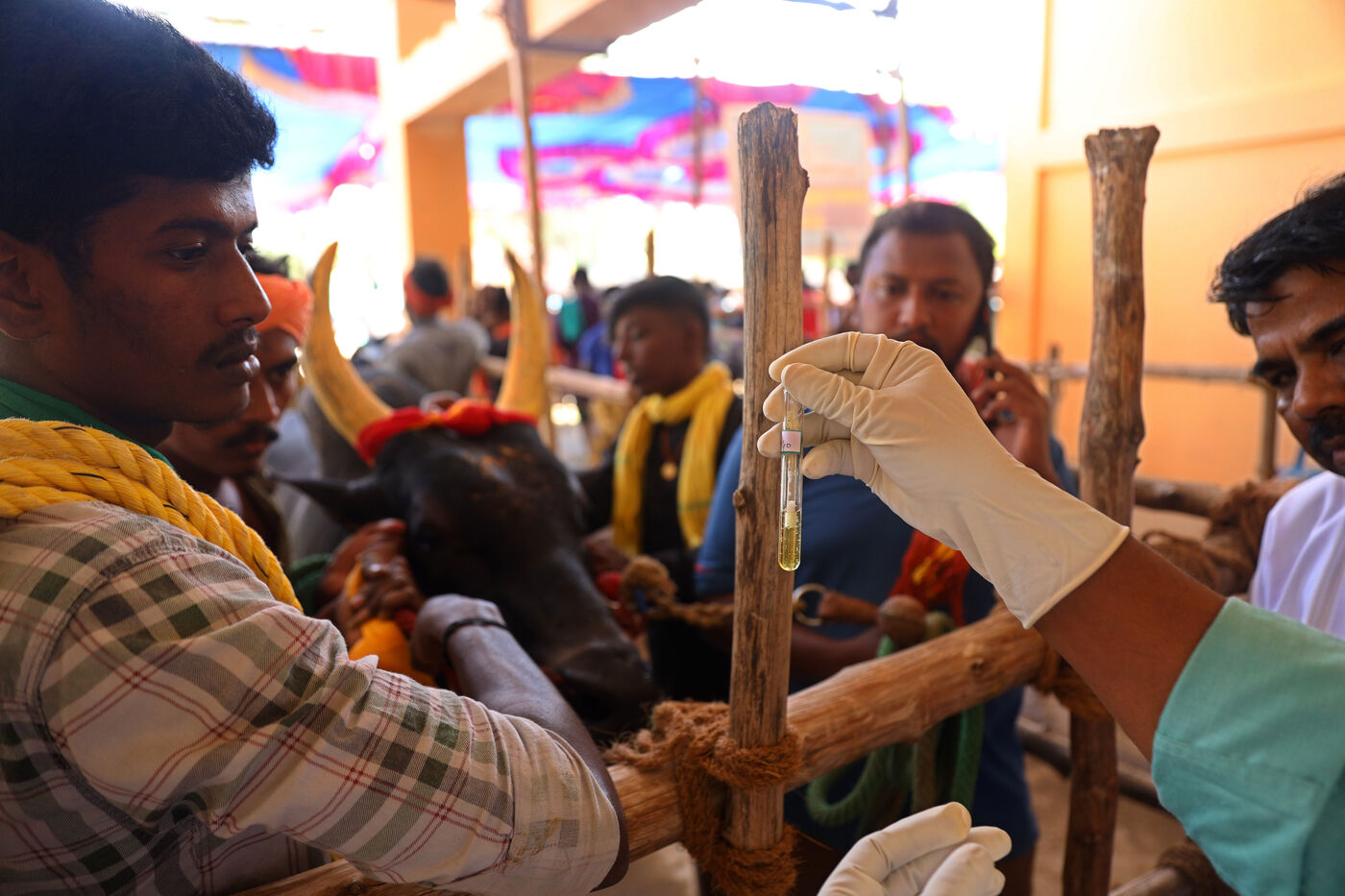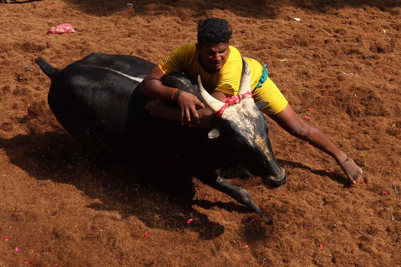 India, Madurai, 2023-15-01. A participant tries to control a bull during the annual traditional bull taming festival "Jallikkattu" in the village of Avaniyapuram on the outskirts of Madurai in Tamilnadu. Jallikattu is a traditional Tamil bull taming sport that takes place during Pongal, a harvest festival in the Indian state of Tamil Nadu. Photograph by Sri Loganathan Velmurugan / Hans Lucas.