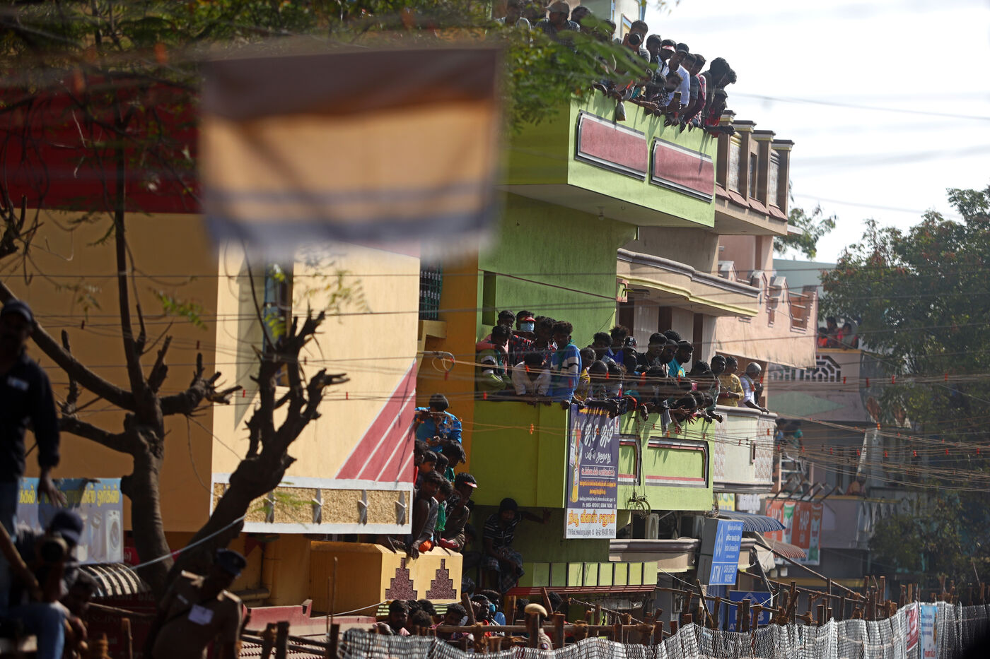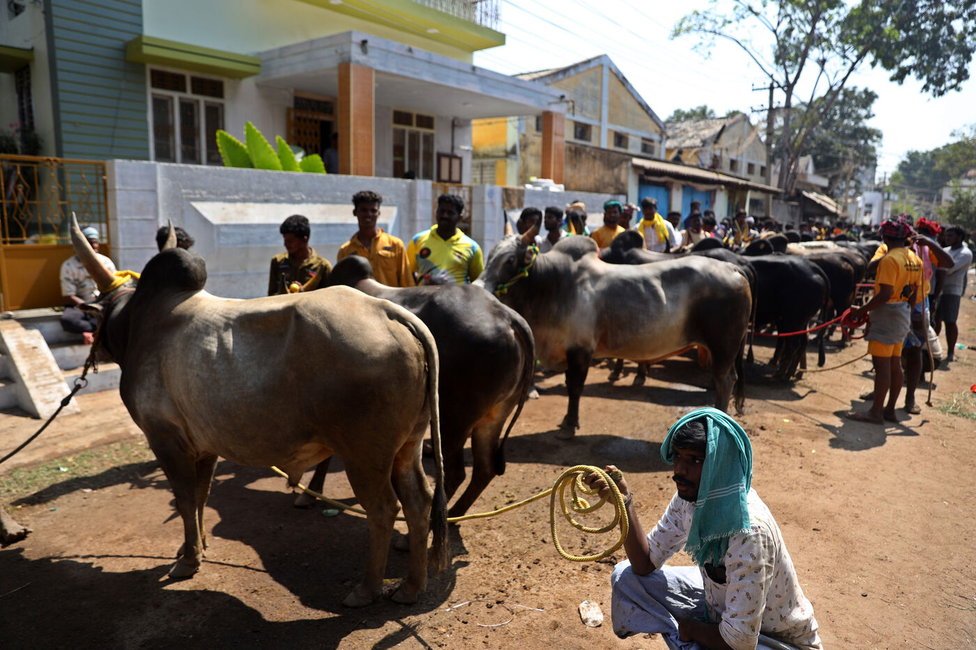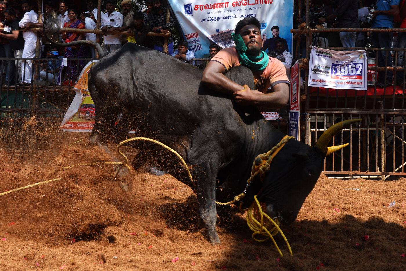Inde, Madurai, 2023-15-01. Un participant essaie de controler un taureau lors du festival traditionnel annuel d'apprivoisement des taureaux "Jallikkattu" dans le village de Avaniyapuram a la peripherie de Madurai dans le Tamilnadu. Jallikattu est un sport traditionnel tamoul d'apprivoisement de taureaux qui se deroule pendant Pongal, une fete des recoltes dans l'Etat indien du Tamil Nadu. Photographie de Sri Loganathan Velmurugan / Hans Lucas.
