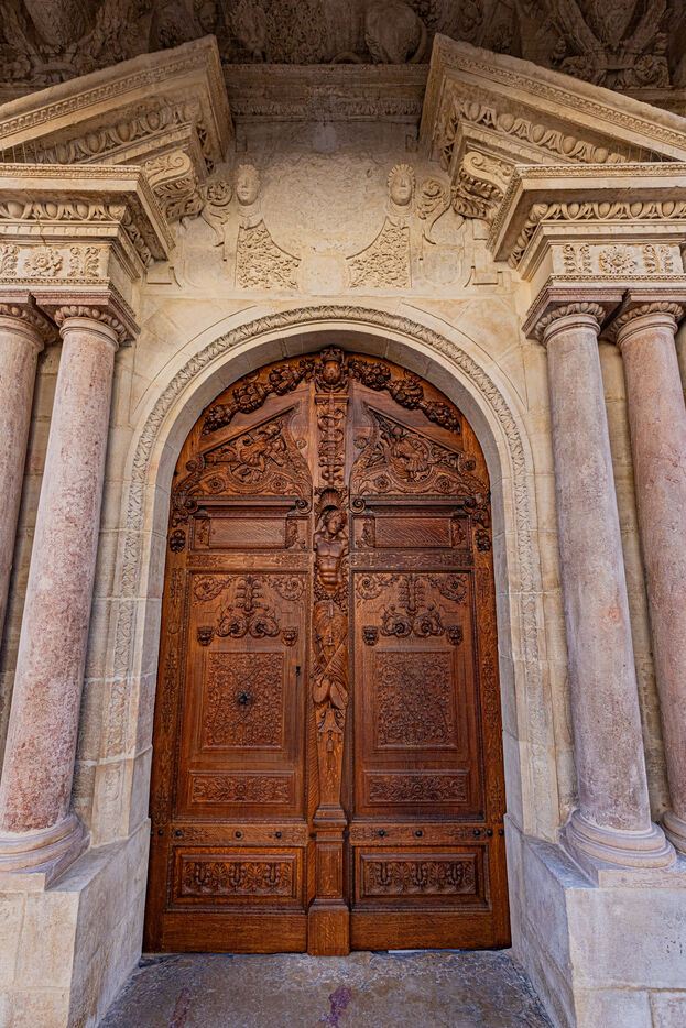 One of the edifice's major works of art is its carved wooden door, which is a faithful copy of the original work by Hughes Sambin (kept in the reserves of Dijon's Musée des Beaux-Arts), executed by M. Vassal of Paris around 1903. This large, arched door, made up of two panels, gave access to the great hall of the Palais du Parlement built in 1572 by Hugues Brouhée.
