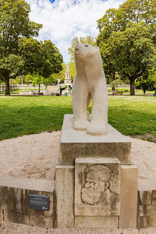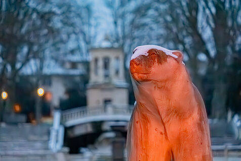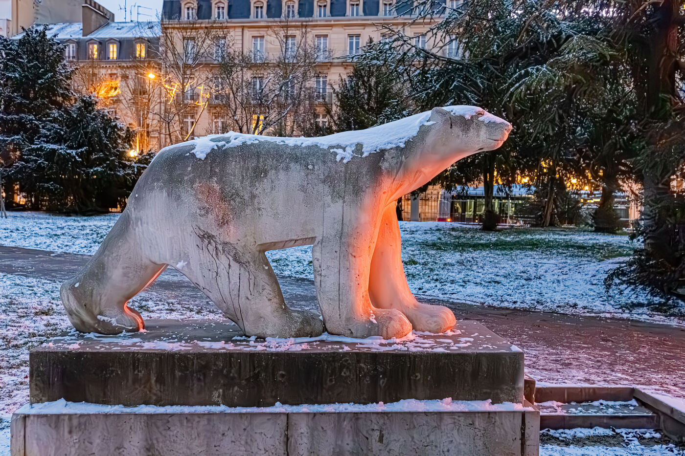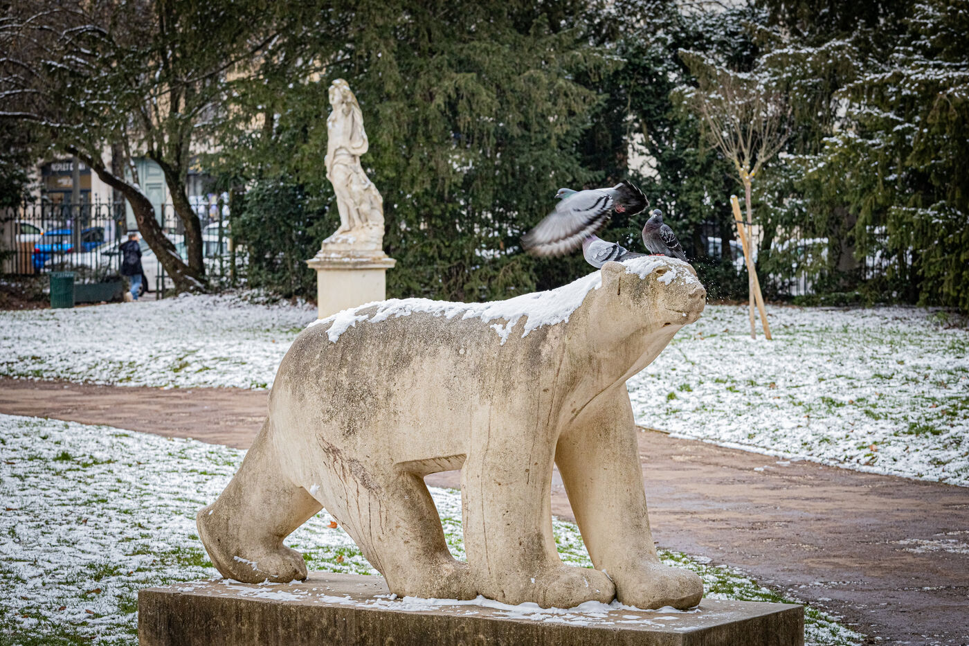 The Pompon bear in Dijon's Darcy garden is wrapped in the soft white of a winter landscape and freshly fallen snow. Then, in spring 2024, it regained its white colour following cleaning using essential oils in compliance with Ecojardins label standards.