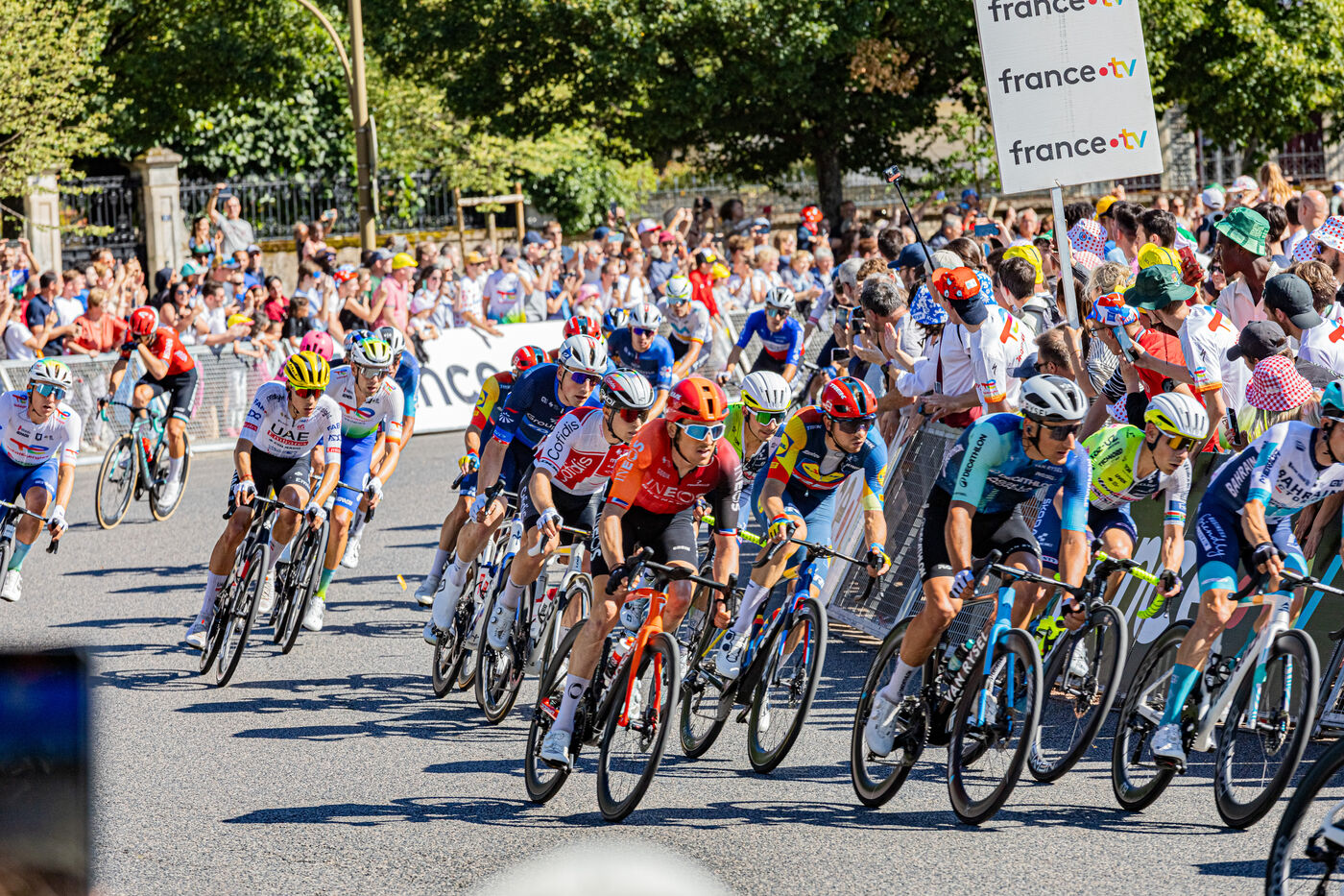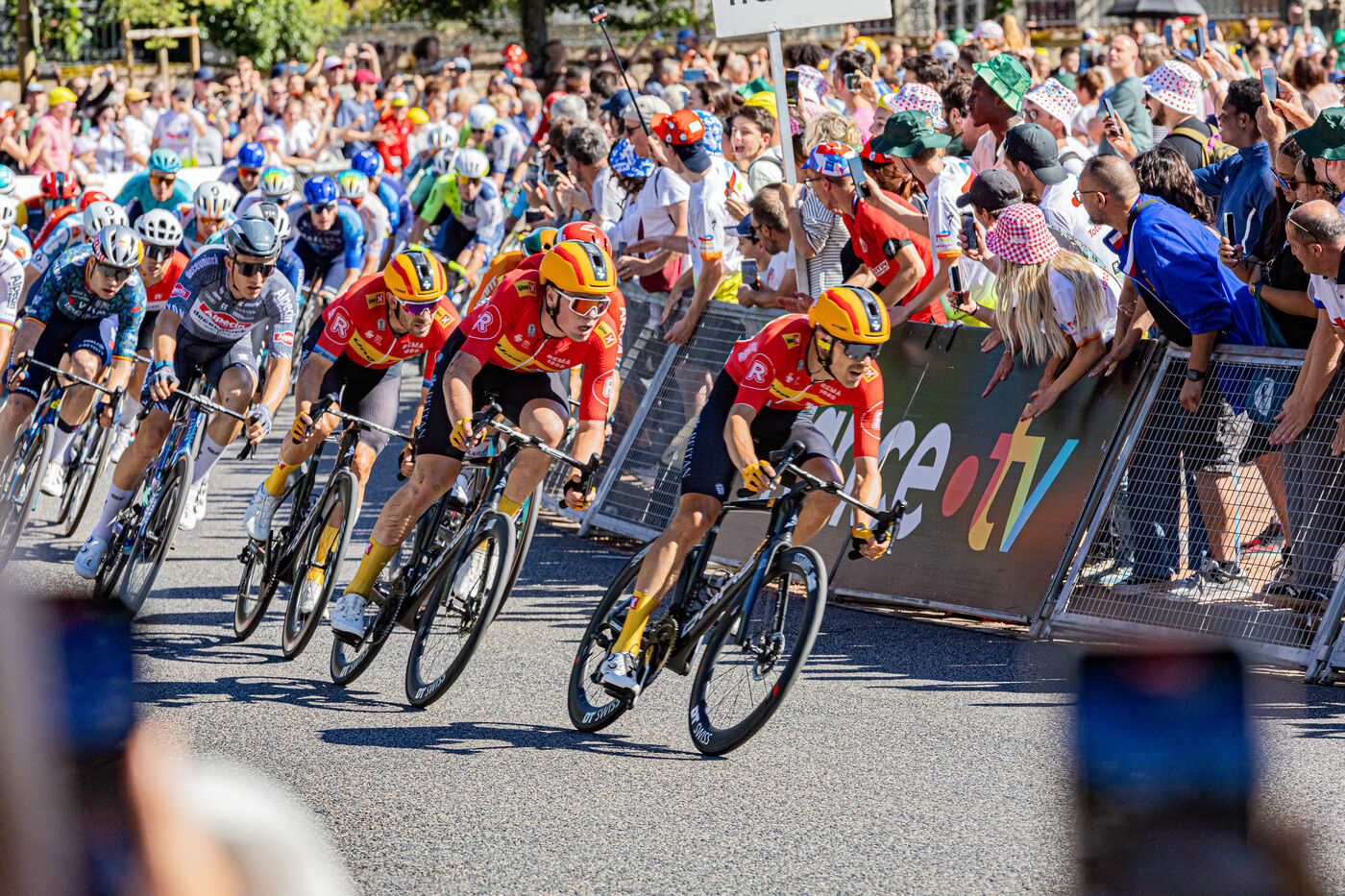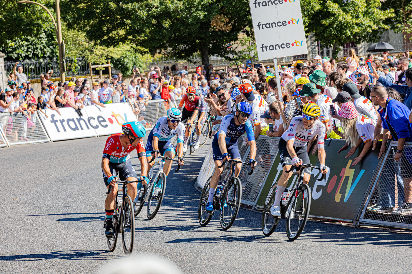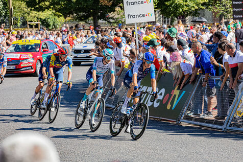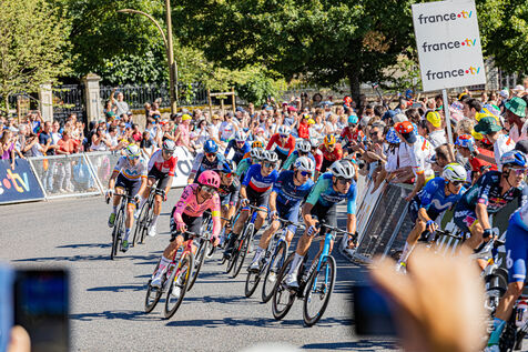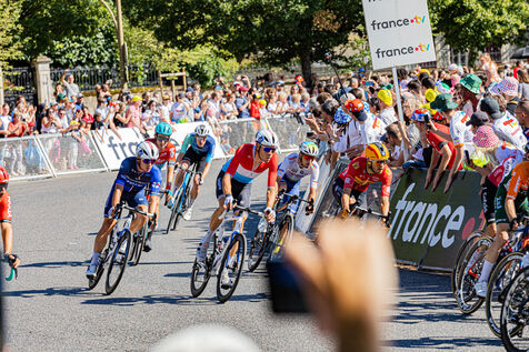 At the finish of stage 6 of the Tour de France 2024 in Dijon, the riders are in the thick of the final turn before the final sprint.