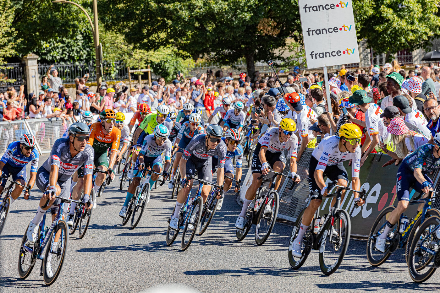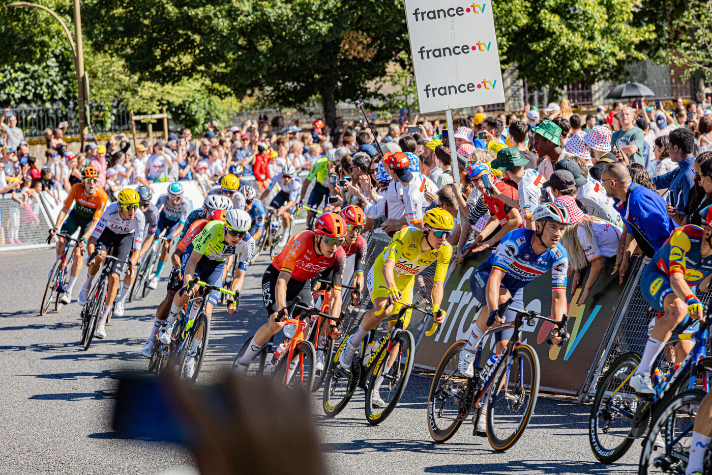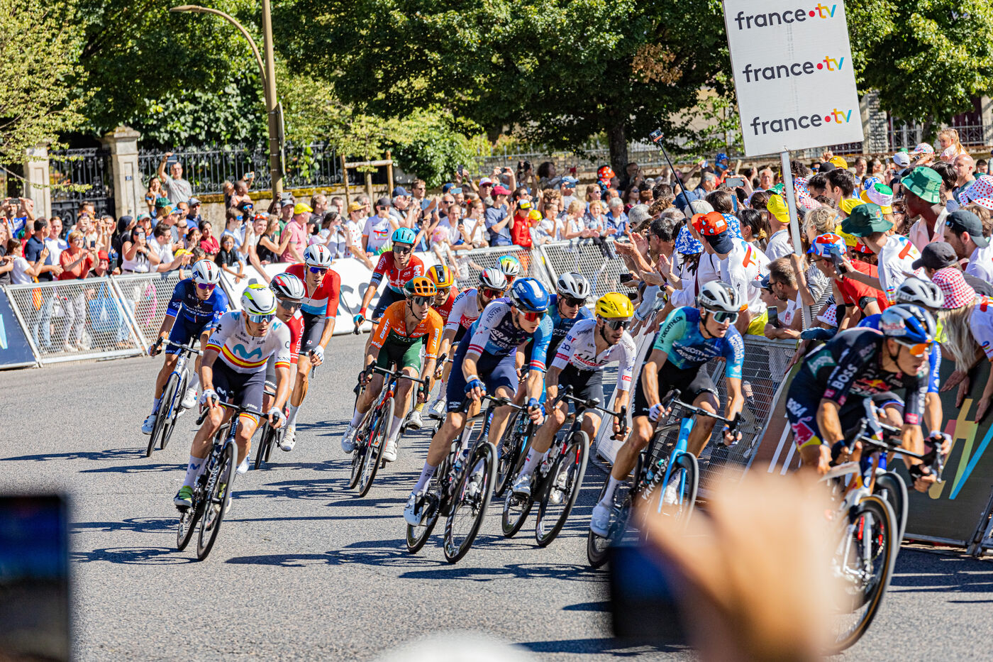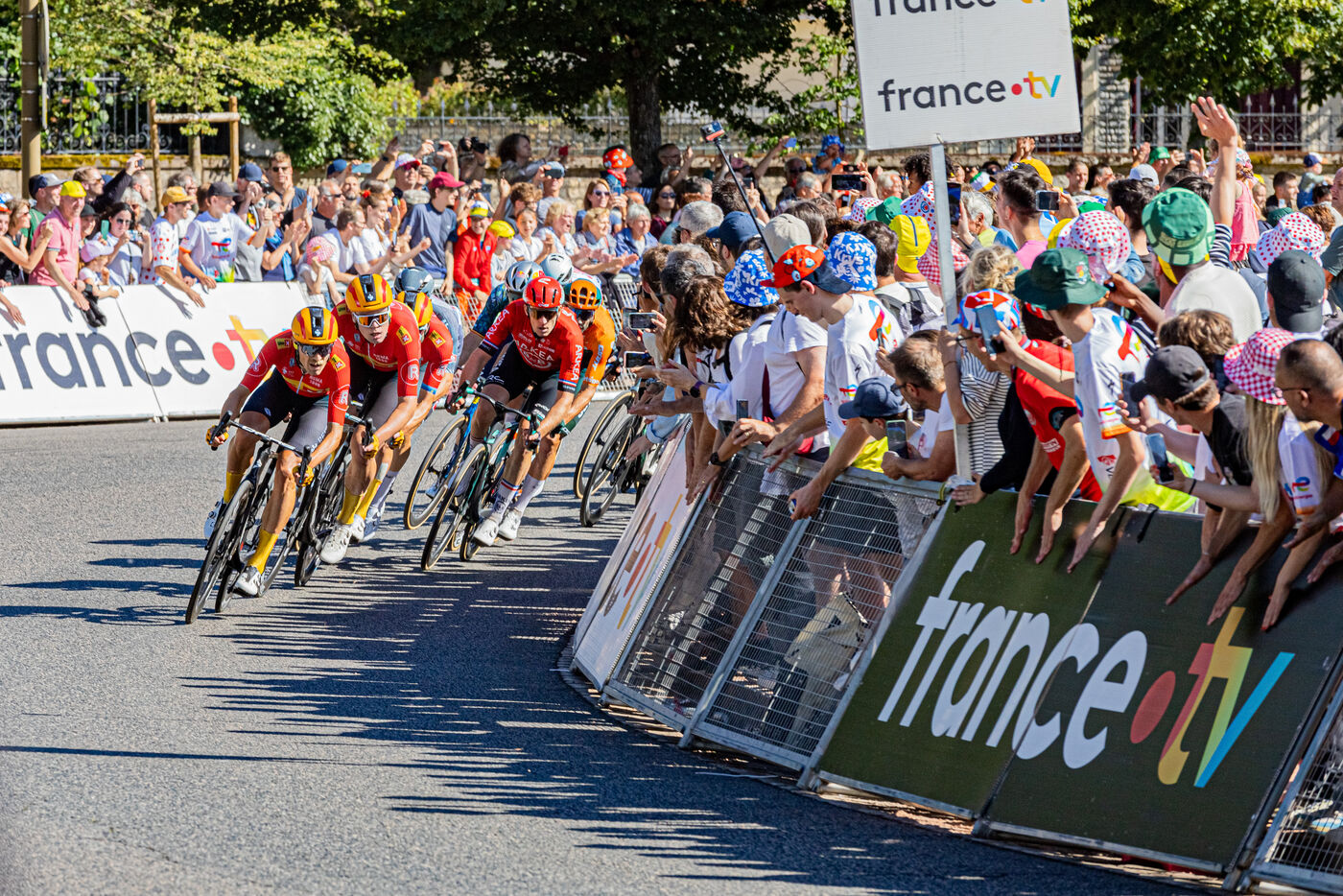 At the finish of stage 6 of the Tour de France 2024 in Dijon, the riders are in the thick of the final turn before the final sprint.
