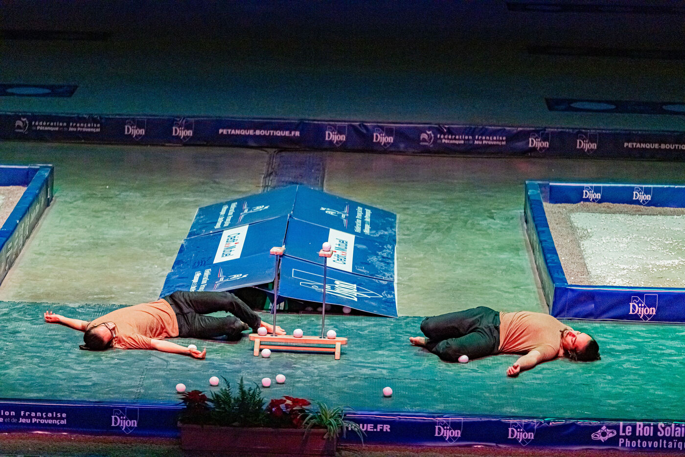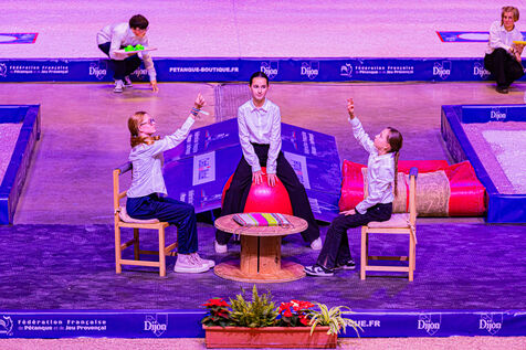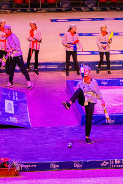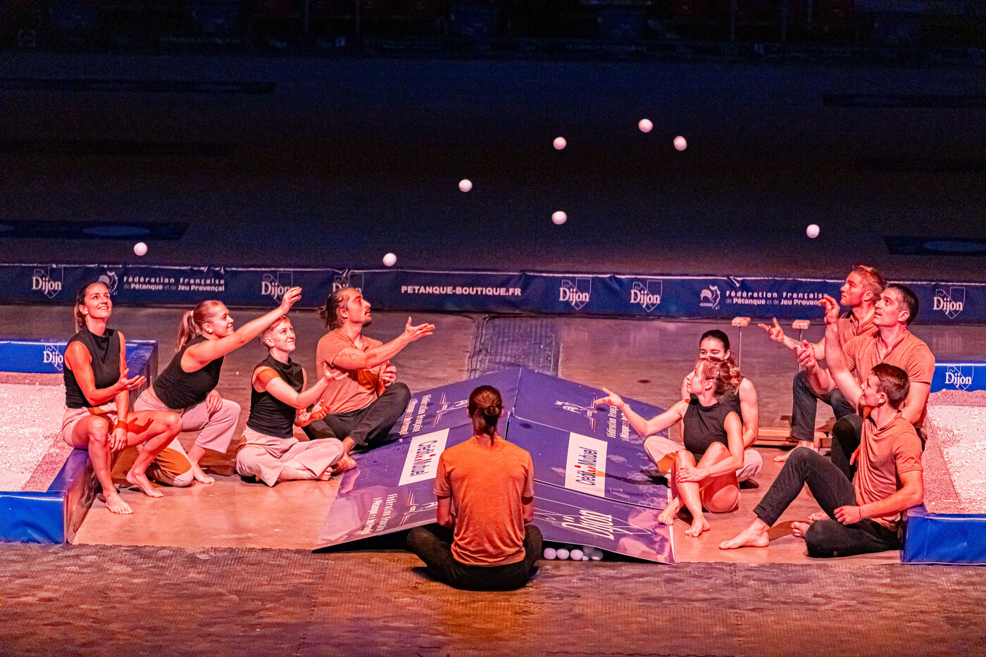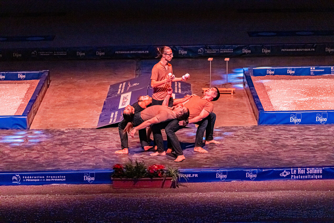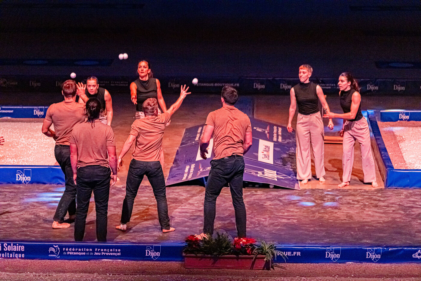 Cérémonie d'ouverture du championnat du monde de pétanque 2024 au zénith de Dijon. Présentation des équipes, des arbitres, discours officiels, spectacle de cirque, jongleries, démonstration, la Fédération Française de Pétanque et Jeu Provencal (FFPJP) a mis les petits plats dans les grands pour assurer le spectacle avant le début de la compétition.