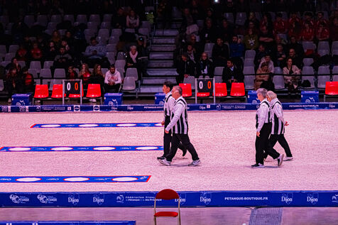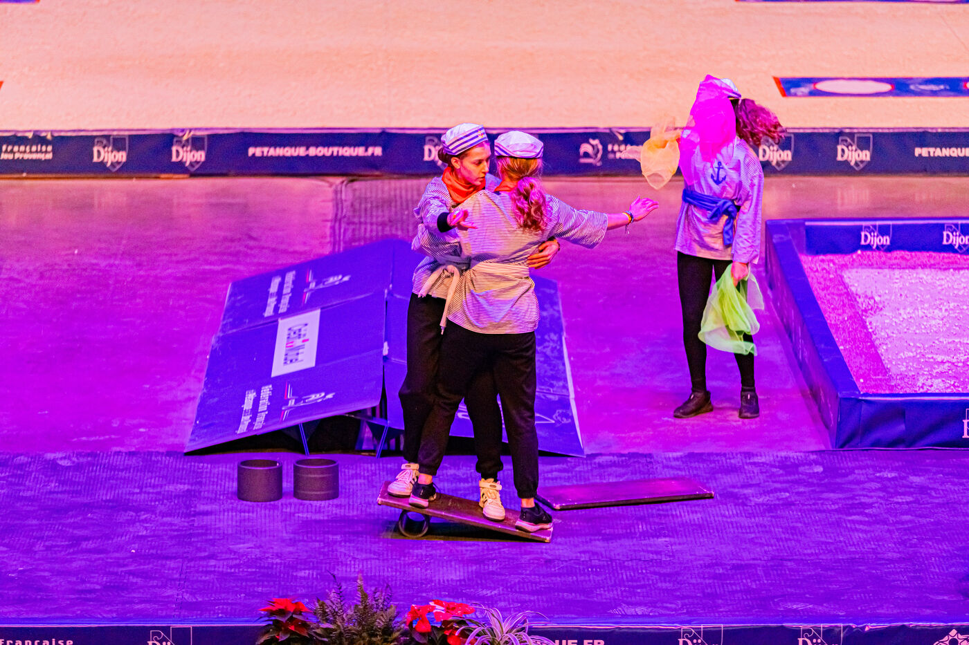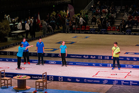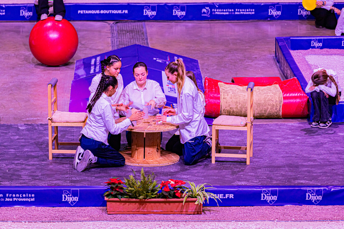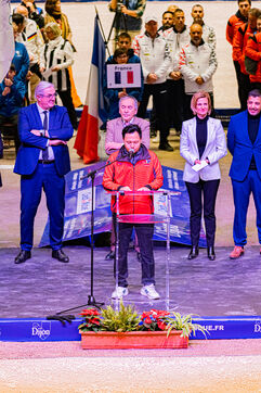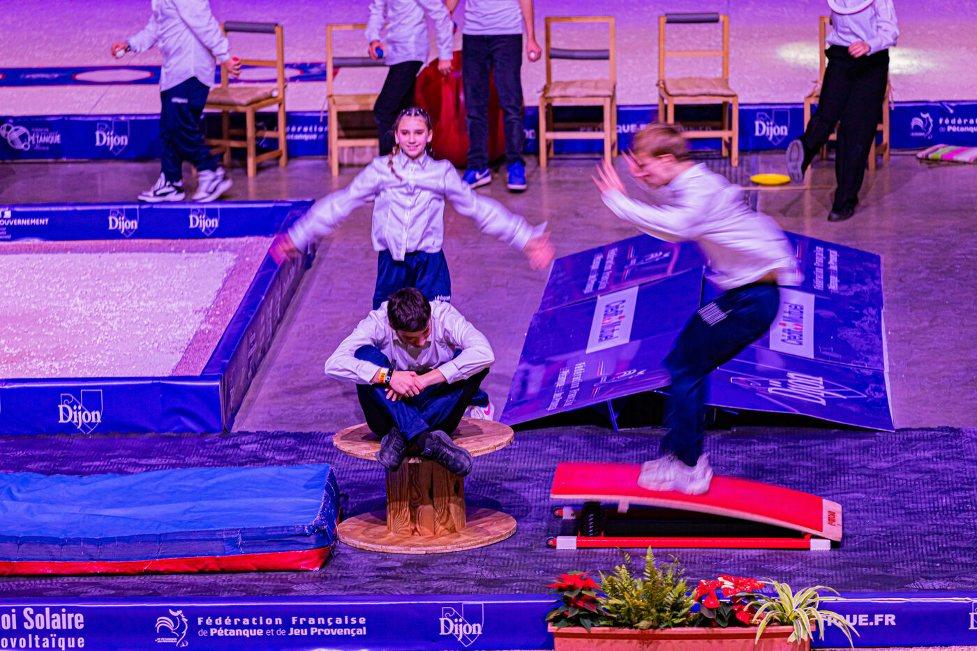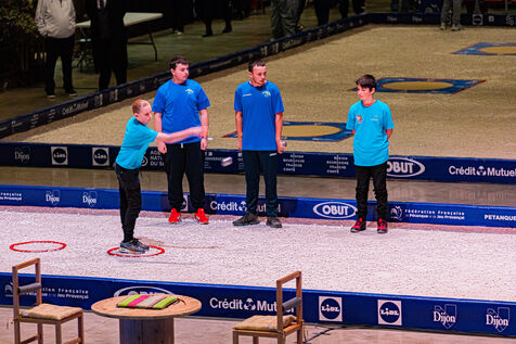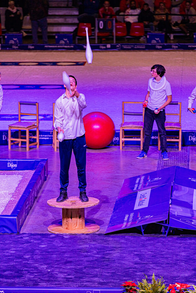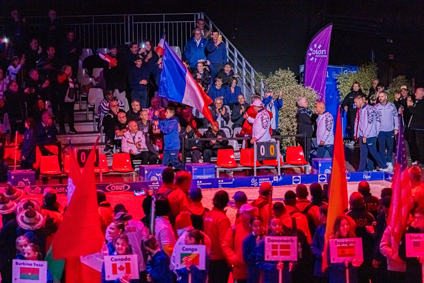 Cérémonie d'ouverture du championnat du monde de pétanque 2024 au zénith de Dijon. Présentation des équipes, des arbitres, discours officiels, spectacle de cirque, jongleries, démonstration, la Fédération Française de Pétanque et Jeu Provencal (FFPJP) a mis les petits plats dans les grands pour assurer le spectacle avant le début de la compétition.