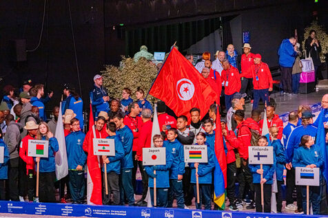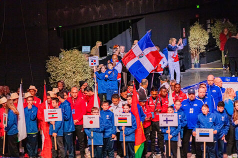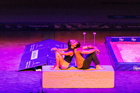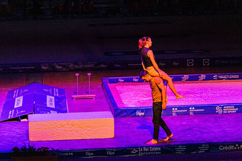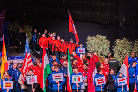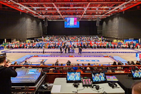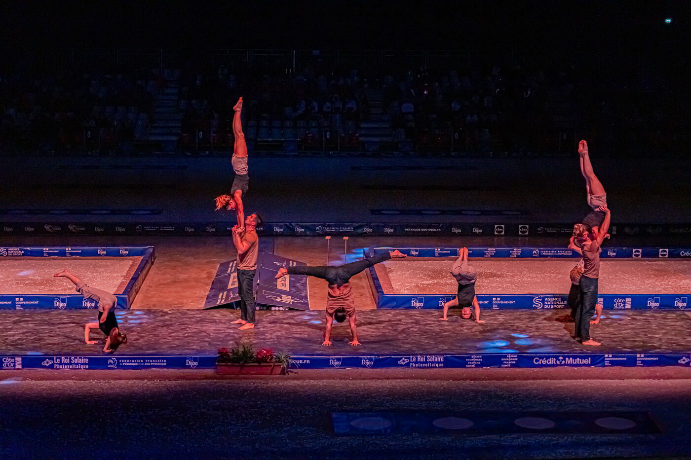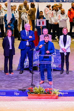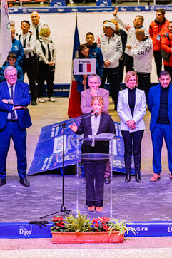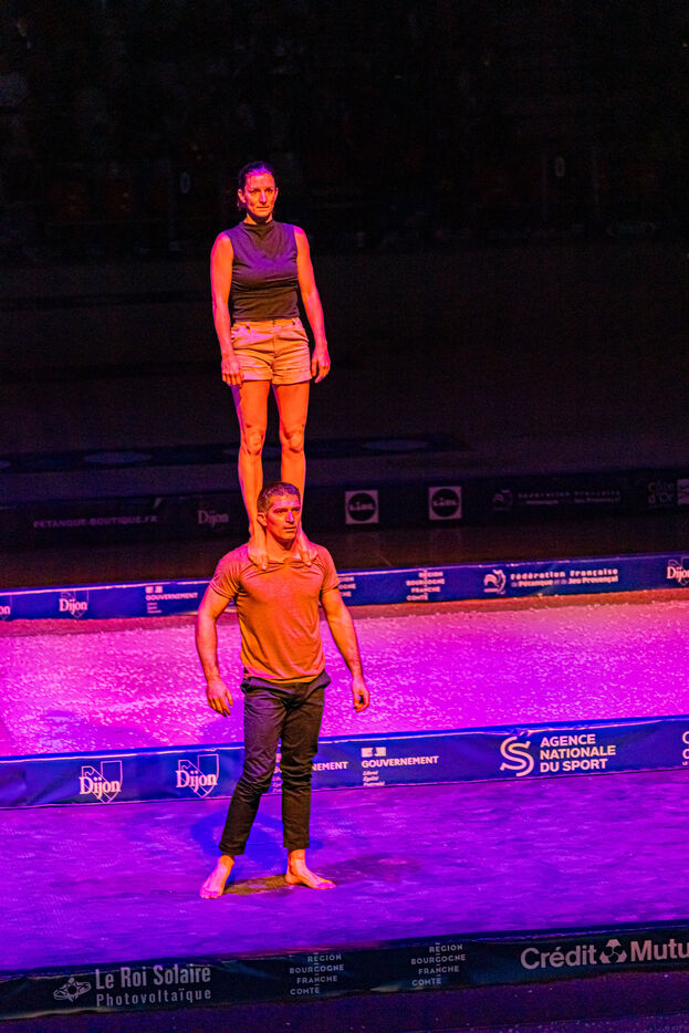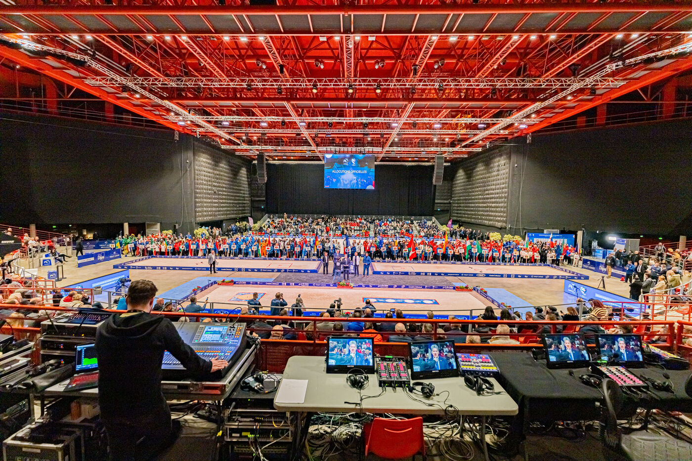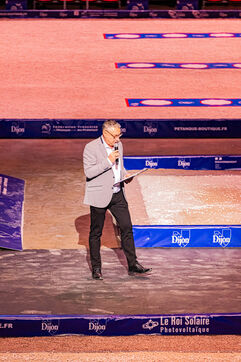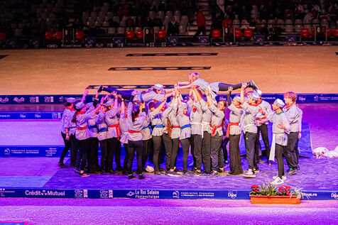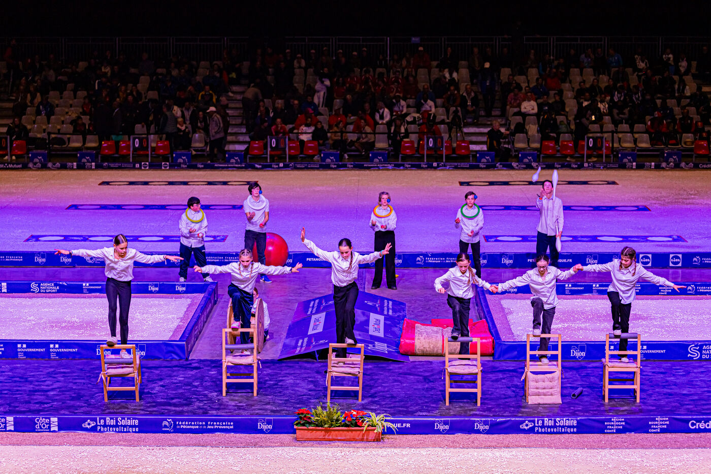 Cérémonie d'ouverture du championnat du monde de pétanque 2024 au zénith de Dijon. Présentation des équipes, des arbitres, discours officiels, spectacle de cirque, jongleries, démonstration, la Fédération Française de Pétanque et Jeu Provencal (FFPJP) a mis les petits plats dans les grands pour assurer le spectacle avant le début de la compétition.