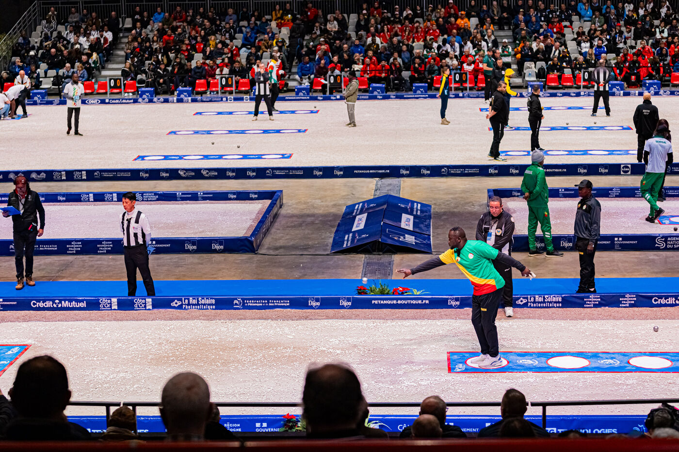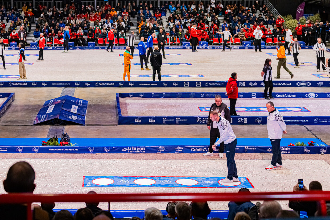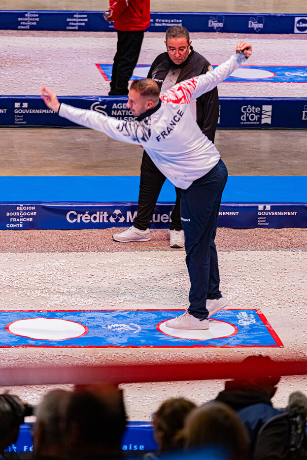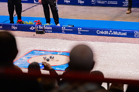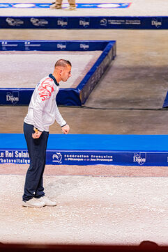 Precision shooting the qualifications with Dylan Rocher at the 2024 World Petanque Championship at the Zenith in Dijon. Illustrations and choreography typical of this discipline. An event that will see Dylan Rocher score only 25 points, narrowly sending him to the repechage, from where he will be eliminated while he was the favorite of the competition, missing his chance to win this event for the 4th time in a row.