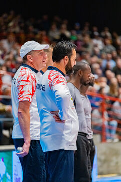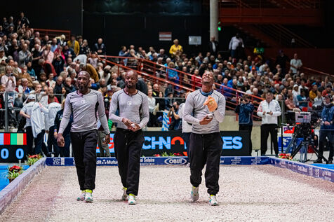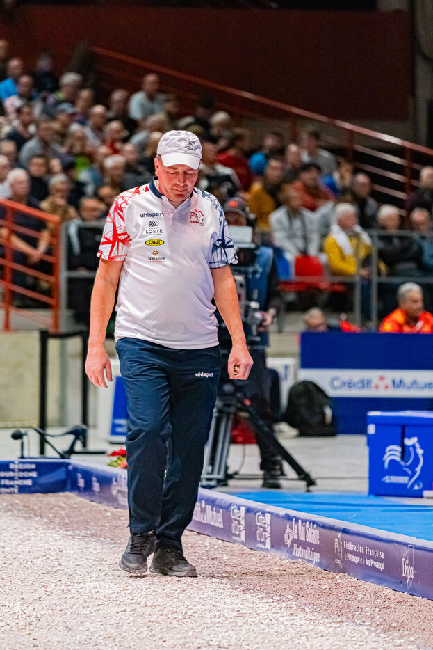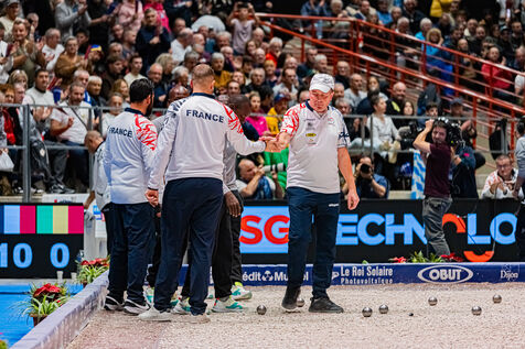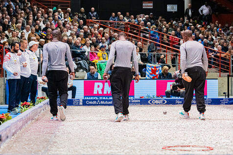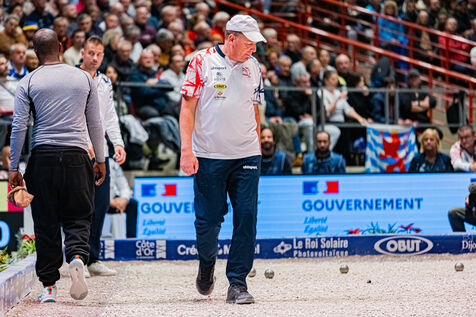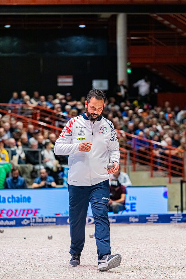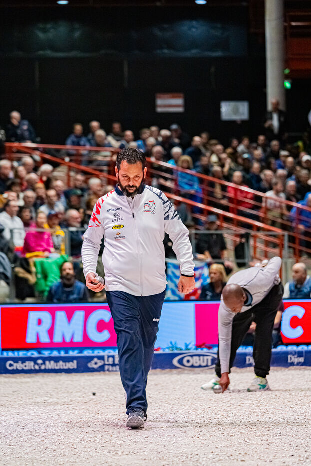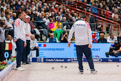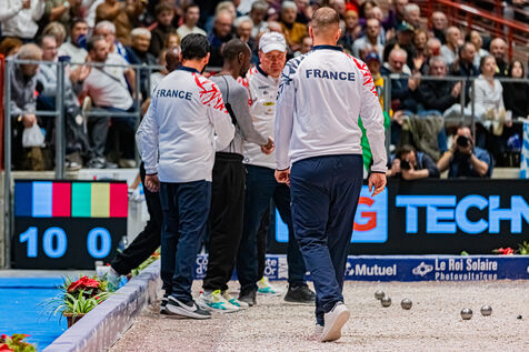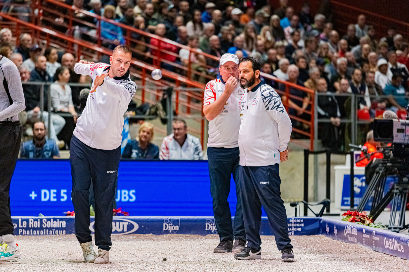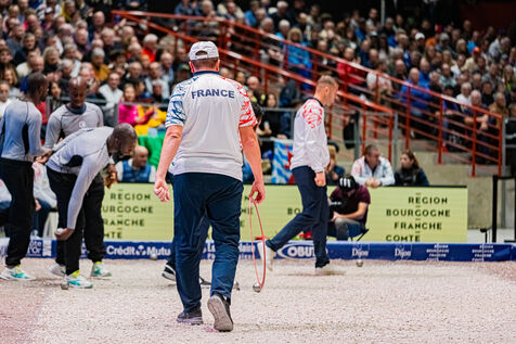 The French team at work at the 2024 World Petanque Championship in Dijon, during the 8th final played against Mali where it won 13 to 0, a beautiful "Fanny". It is composed of Philippe Suchaud, Dylan Rocher, Henri Lacroix and Jean Feltain, trained by David Le Dantec.