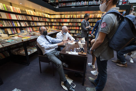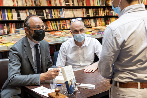 L'ancien Premier ministre et actuel maire du Havre, Edouard Philippe et Gilles Boyer dedicacent leur livre "Impressions et lignes claires"