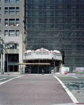 But he has also carefully documented the contextual surroundings of these venues, America and California?s aging infrastructure, and the less romantic elements of urban and rural life. Power lines, security cameras, gates, bars, graffiti, and parking lots are just some of the contextual elements that frame, intervene, and contrast with these buildings. In Zaubitzer?s images of the Tower Theatre in San Francisco and one of several troubled cinemas in Hollywood, he draws a contrast: that these dreamscapes have been impacted by urban development and abandonment.