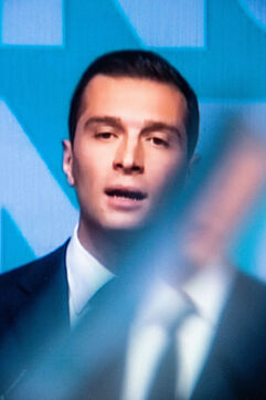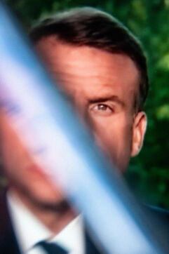 Screenshot of televised speeches by Emmanuel Macron and Jordan Bardella following the result of the european éctions on june 9 2024.