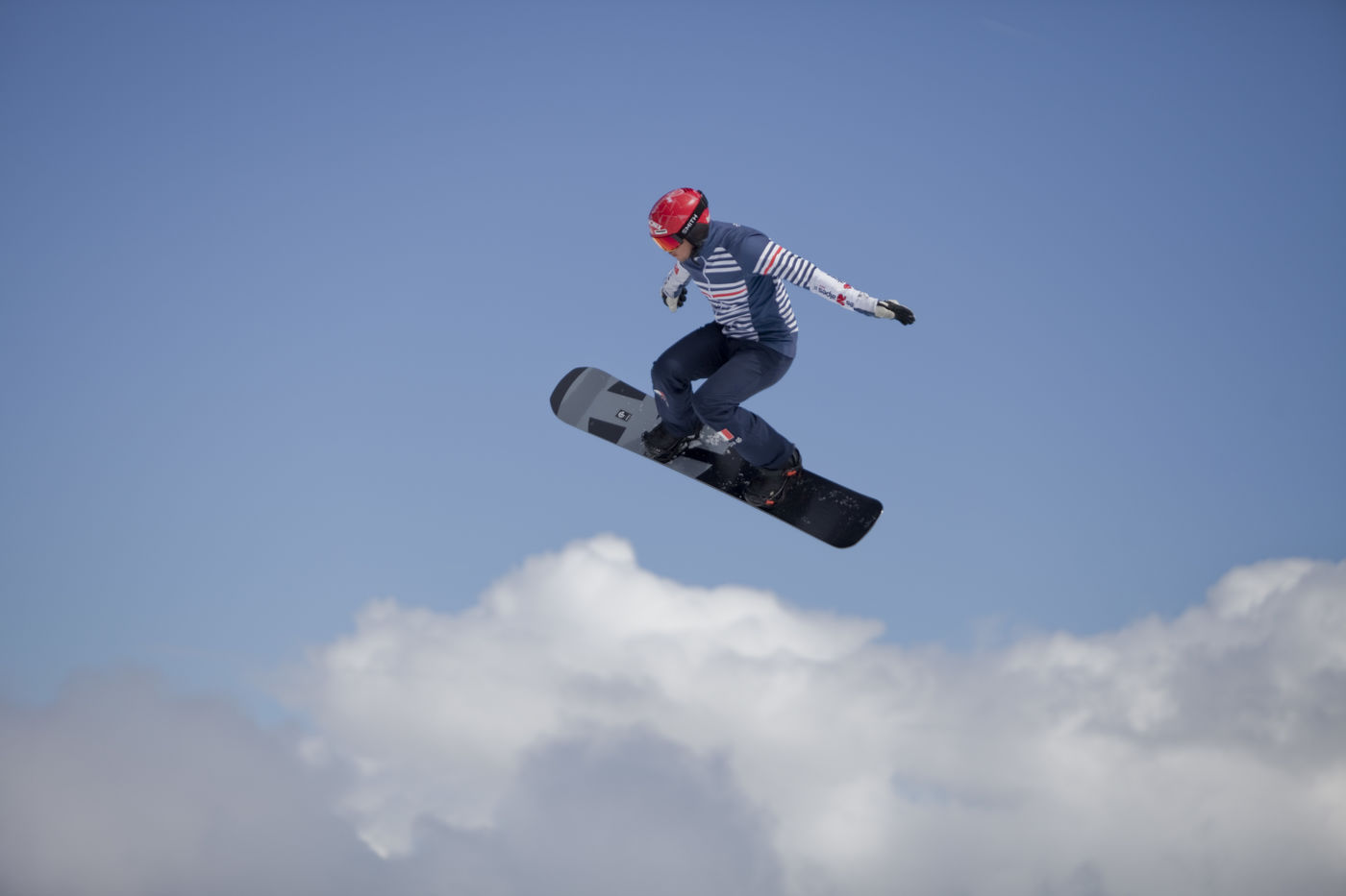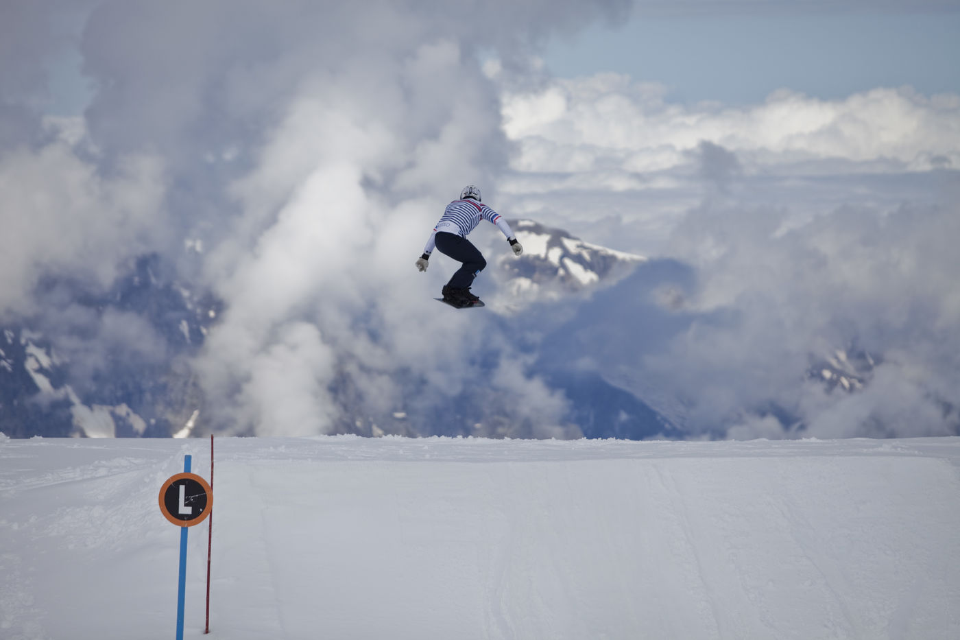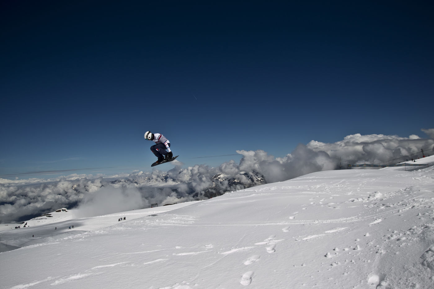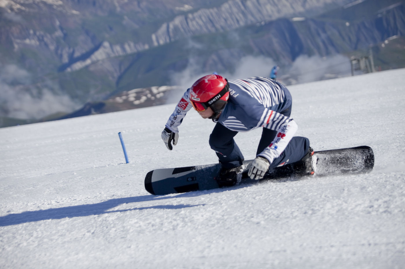 J'ai pu suivre pendant une journée l'équipe de France de snowboard cross. La journée a commencé sur le glacier à 6h30 par un entraînement en slalom géant, puis des passages sur une bosse pour perfectionner la technique de saut.