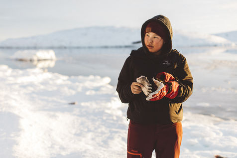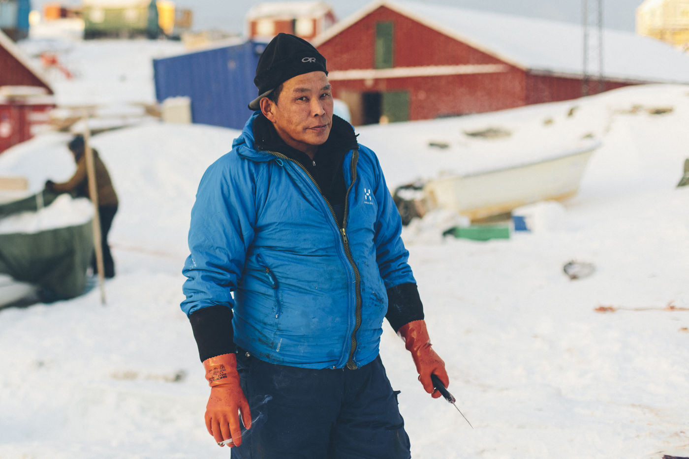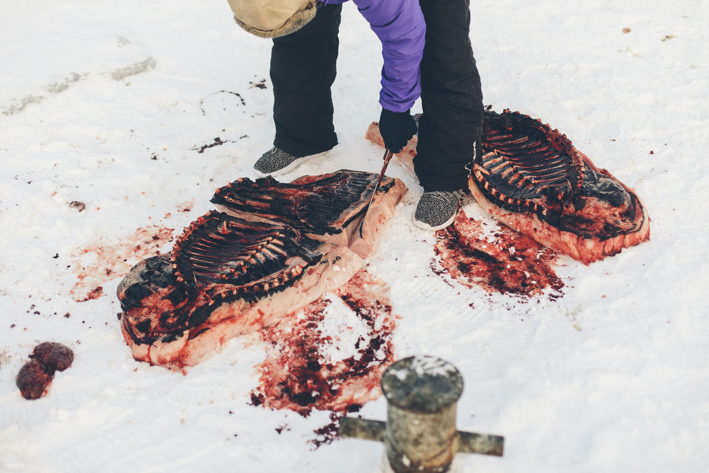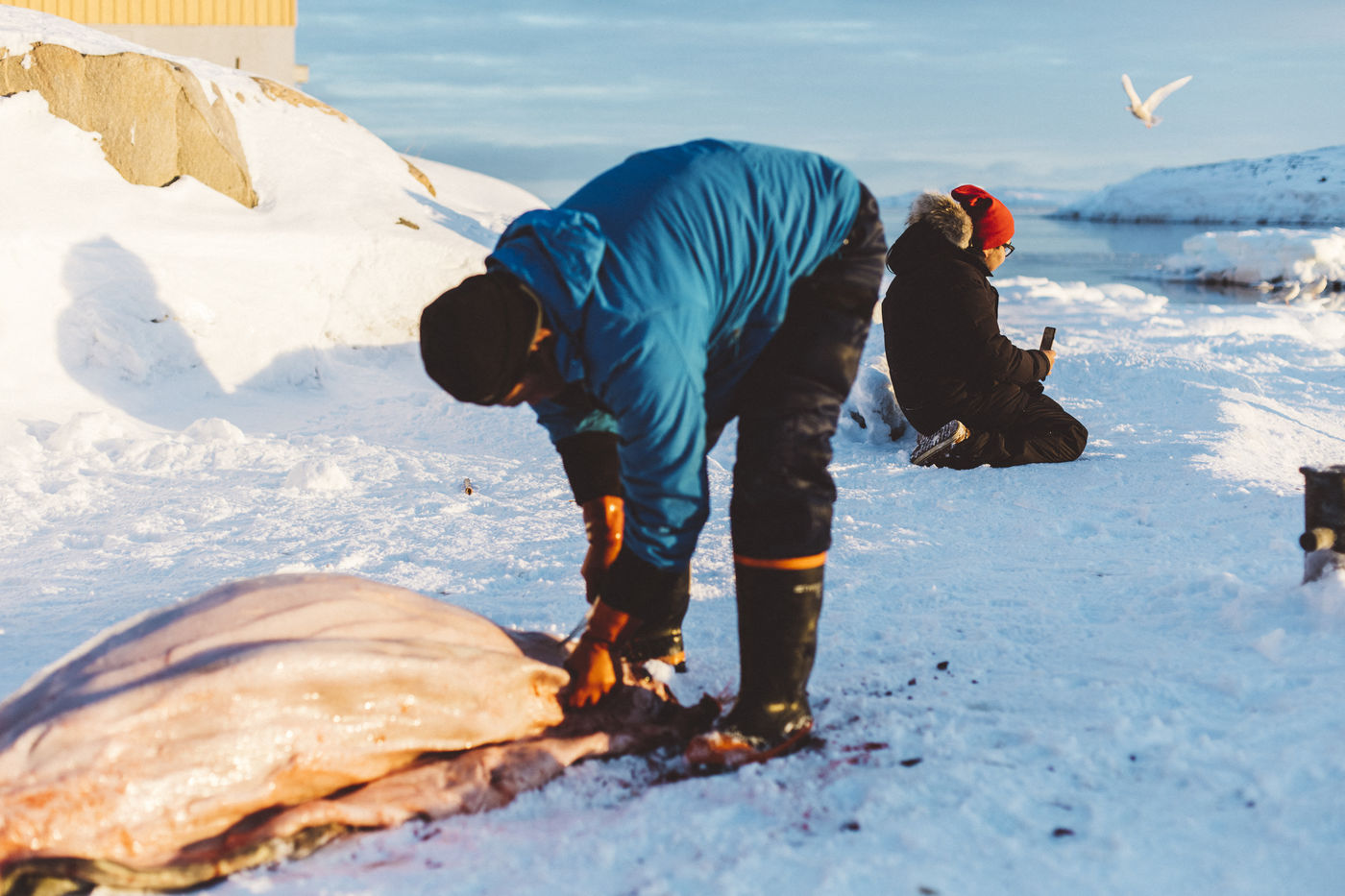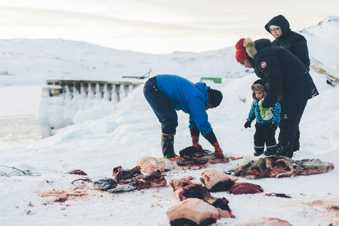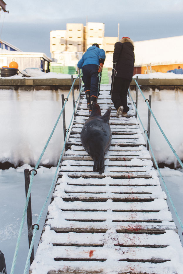 Lars Olsen, l'un des meilleurs chasseurs du villages a tué deux phoques du Groenland ce matin. Il les décharge avec l'aide de ses enfants, et les dépèce dans la neige, sous les cris affamés des goélands.