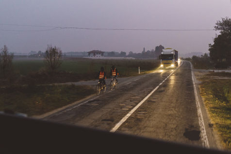 Après la pesée de la marchandise et un coup de balai sur la remorque, le camion repart pour quelques kilomètres. À travers le pare-brise, les villages défilent avec leurs églises et leurs rue étroites. Le Piémont n'est pas toujours un pays pour le poids-lourd. C'est un détour de plusieurs dizaines de kilomètres qu'il doit faire pour récupérer un petite palette, commande urgente d'un client fidèle. "En tant qu'indépendant, on doit tout faire : la conduite bien sûr, et tout ce qui s'y rapporte, de l'entretien du camion à la mécanique. Mais aussi la relation avec les clients qui est primordiale, la gestion des différentes commandes et du planning, des horaires et toute la partie administrative. Chaque fois que je livre un client, j'essaie de programmer un nouveau voyage."