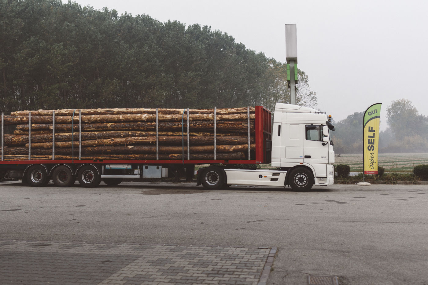 Il est 4h30, la nuit est encore profonde en ce mois d'octobre. Dans le silence de son hangar, Christian Pierre se prépare à prendre la route. Son camion, un DAF de 500 chevaux ronronne doucement, prêt à tirer ses 30 tonnes de bois jusqu'au sommet du col de Larche culminant à près de 2000 mètres d'altitude, frontière la plus proche avec l'Italie, avant de redescendre à travers le Piémont Italien et le pays du Mont Viso. Dans la lumière des phares, quelques cerfs apparaissent sur bord de la route, les renards se cachent et la radio grésille. "La solitude nous offre aussi une plus grande capacité à nous émerveiller de nos voyages murmure-t-il derrière son volant." Parfois ce sont des hommes en vélo qui frôlent les poids-lourd dans la nuit. "Eux, ce sont de vrais esclaves raconte le chauffeur. Payés comme des rats, à chaque camion qui les croisent, ils risquent leur peaux."