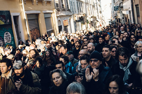 5 décembre 2018. Marseille. France. À 9h05 ce 5 décembre, soit un mois pile après l'effondrement des immeubles de la rue d'Aubagne qui ont causés la mort de 8 personnes, un hommage a été rendu par les habitants du quartier aux personnes disparues. 8 minutes de silence ont été observées, ainsi qu'une supplémentaire en mémoire de Zineb Redouane, une femme de 80 ans décédée au cours d'une manifestation à cause d'une grenade lacrymogène de la police. Les habitants ont regrettés l'absence de personnalité de la mairie, leur silence et le manque d'accompagnement.