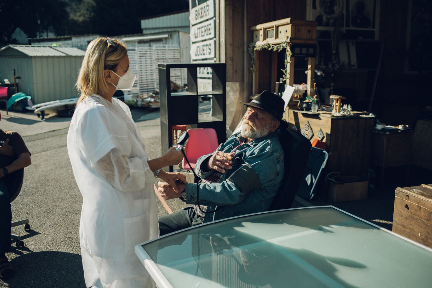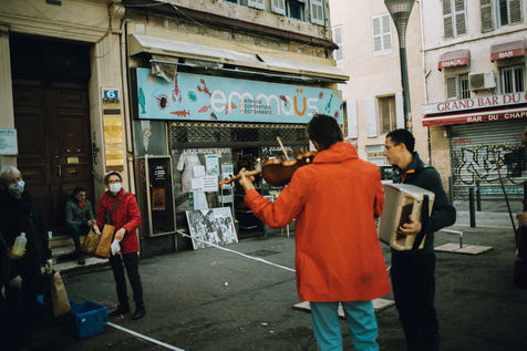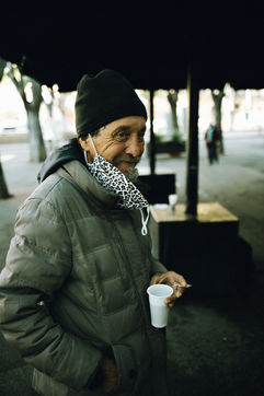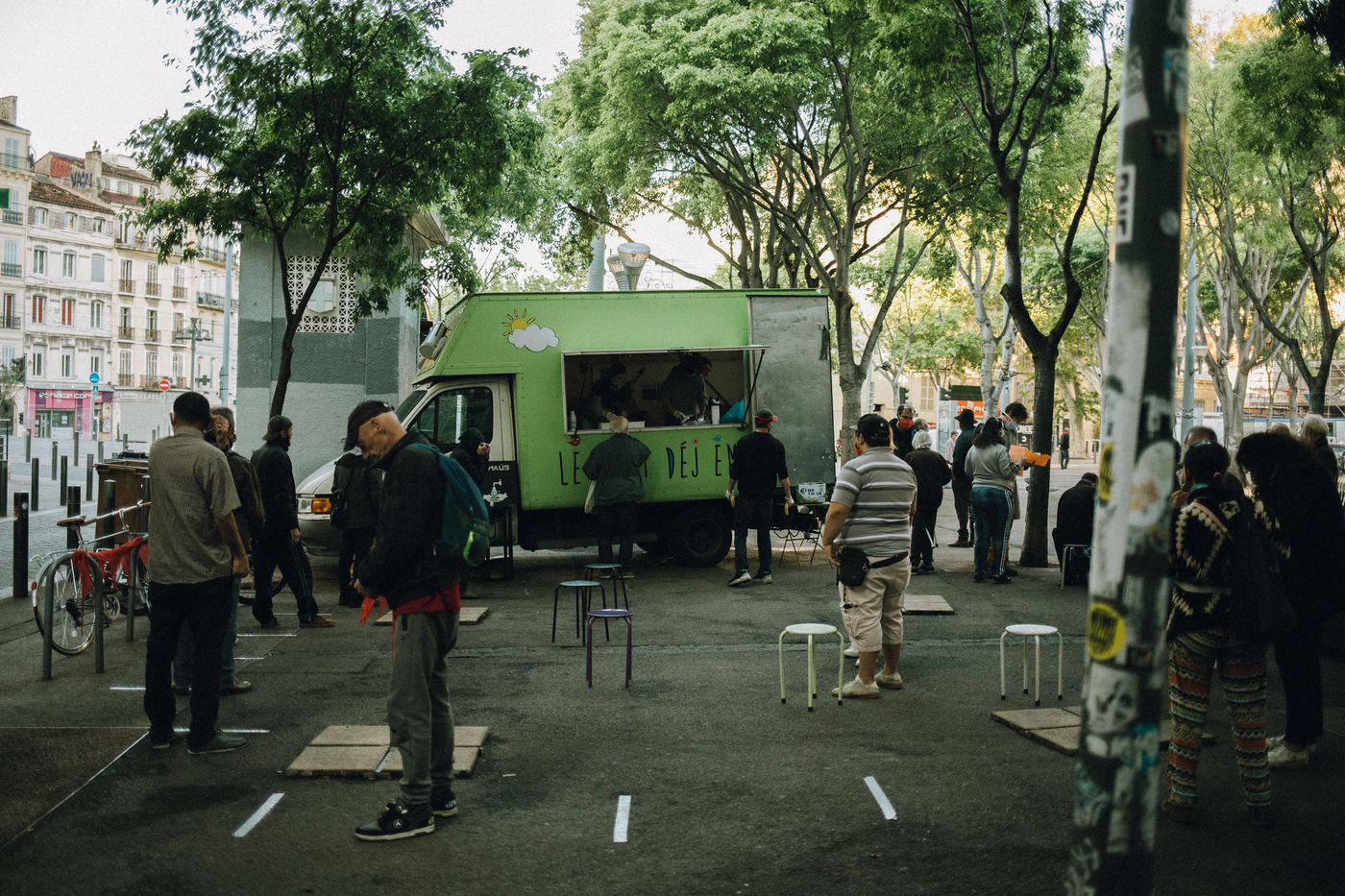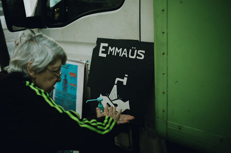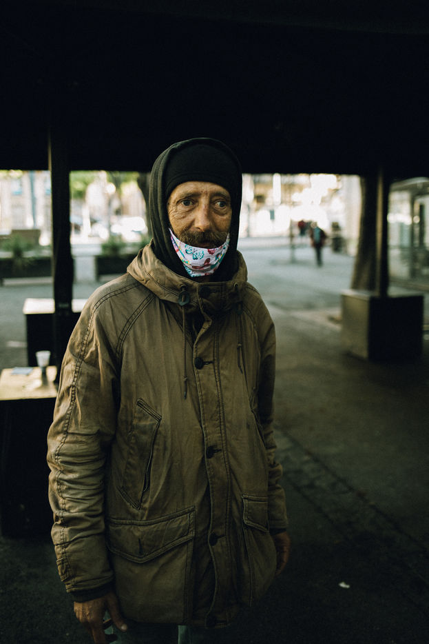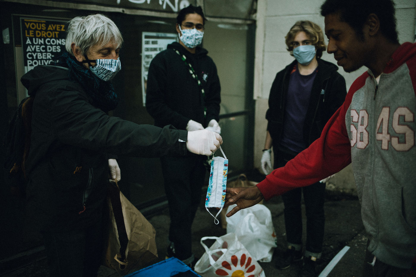 April 24, 2020. Marseille. France. Volunteers from the Emmaus community in Marseille distribute breakfast to homeless people. This is an opportunity for the volunteers to distribute fabric masks, exit certificates and reminders of barrier gestures.