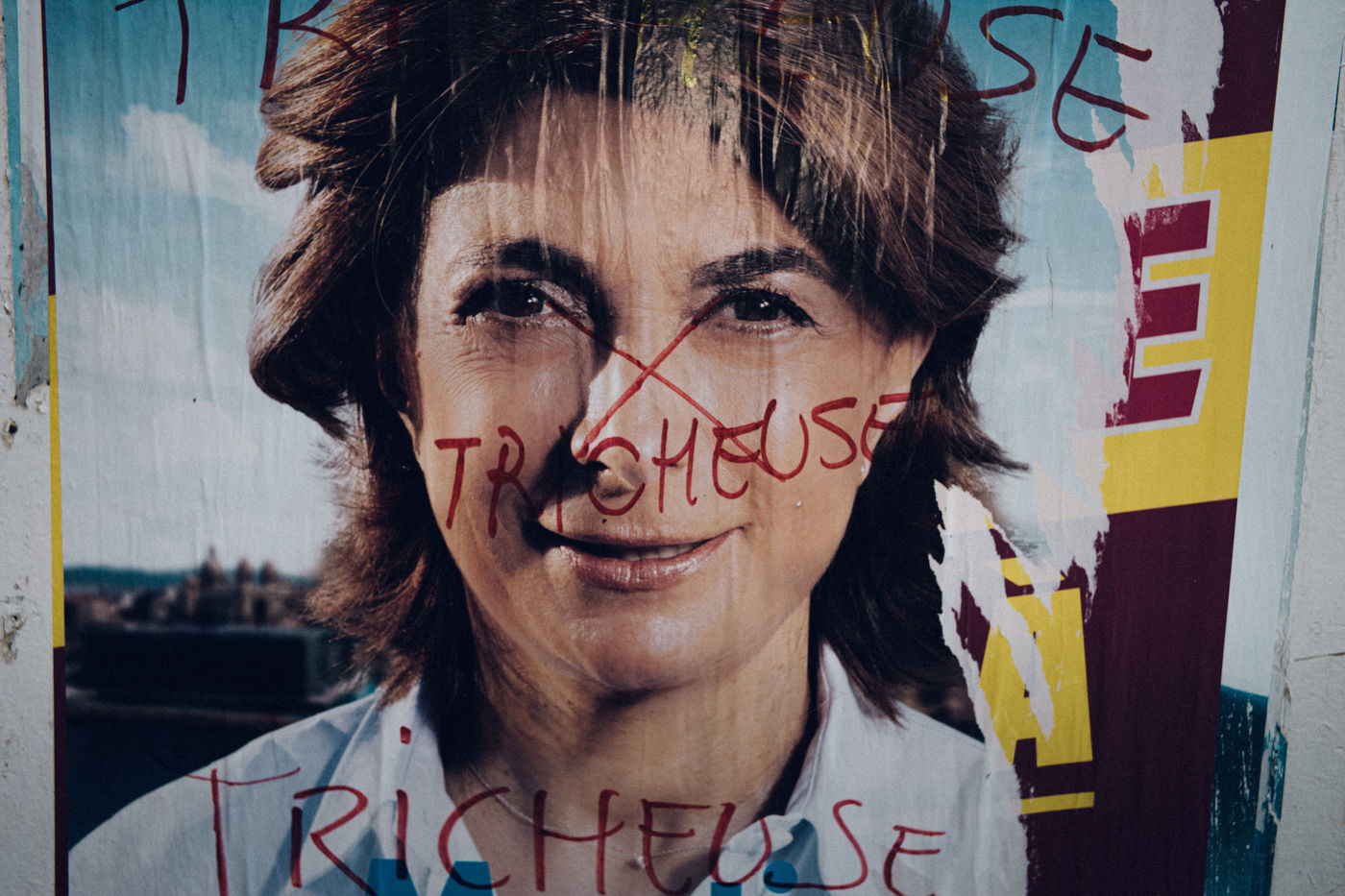 June 15, 2020. Marseilles. An electoral poster of the LR candidate in the municipal elections of the city of Marseille, Martine Vassal, tagged with the word "cheat" in reference to the accusations of cheating at the proxies that hang over her.
