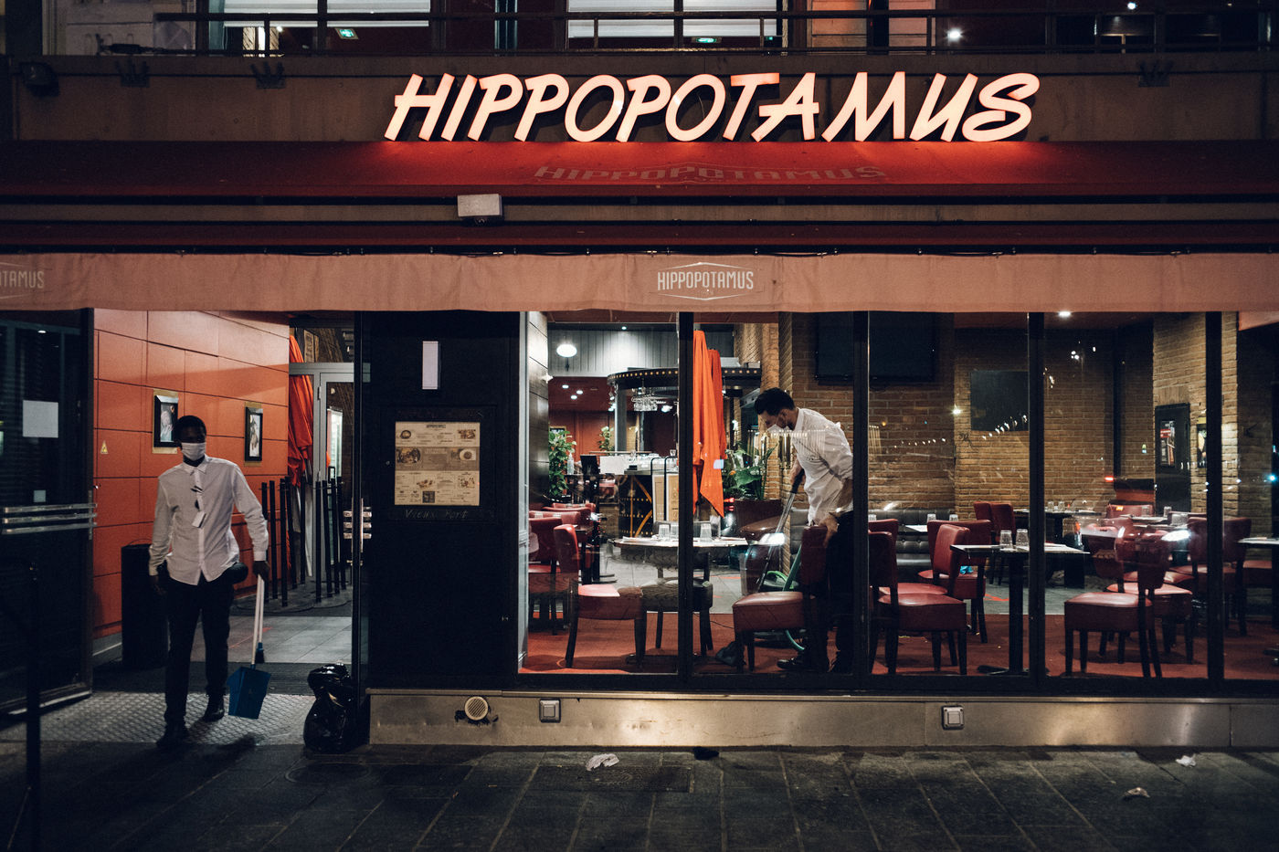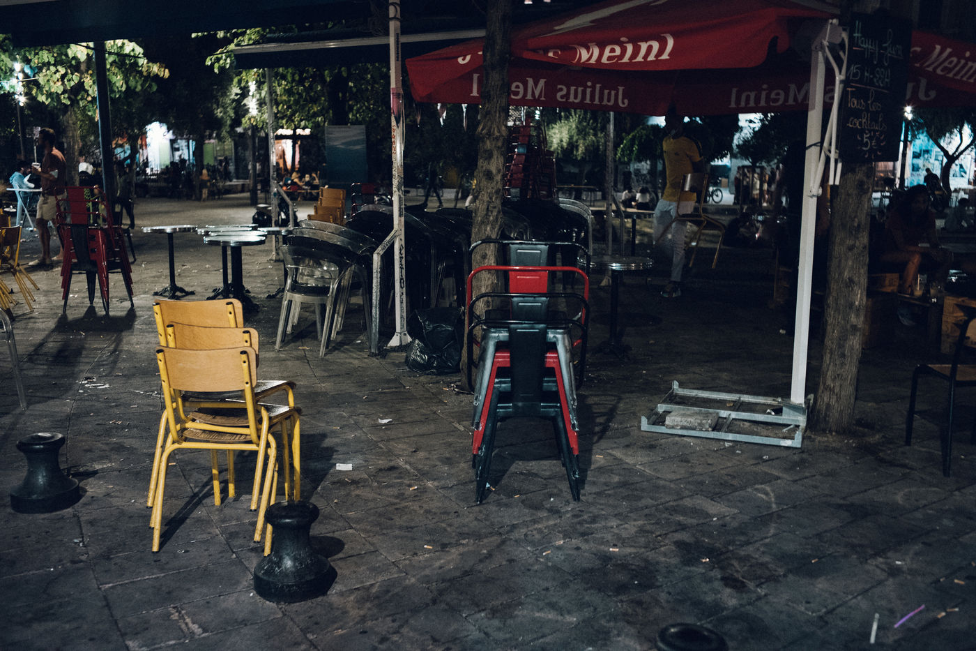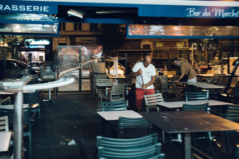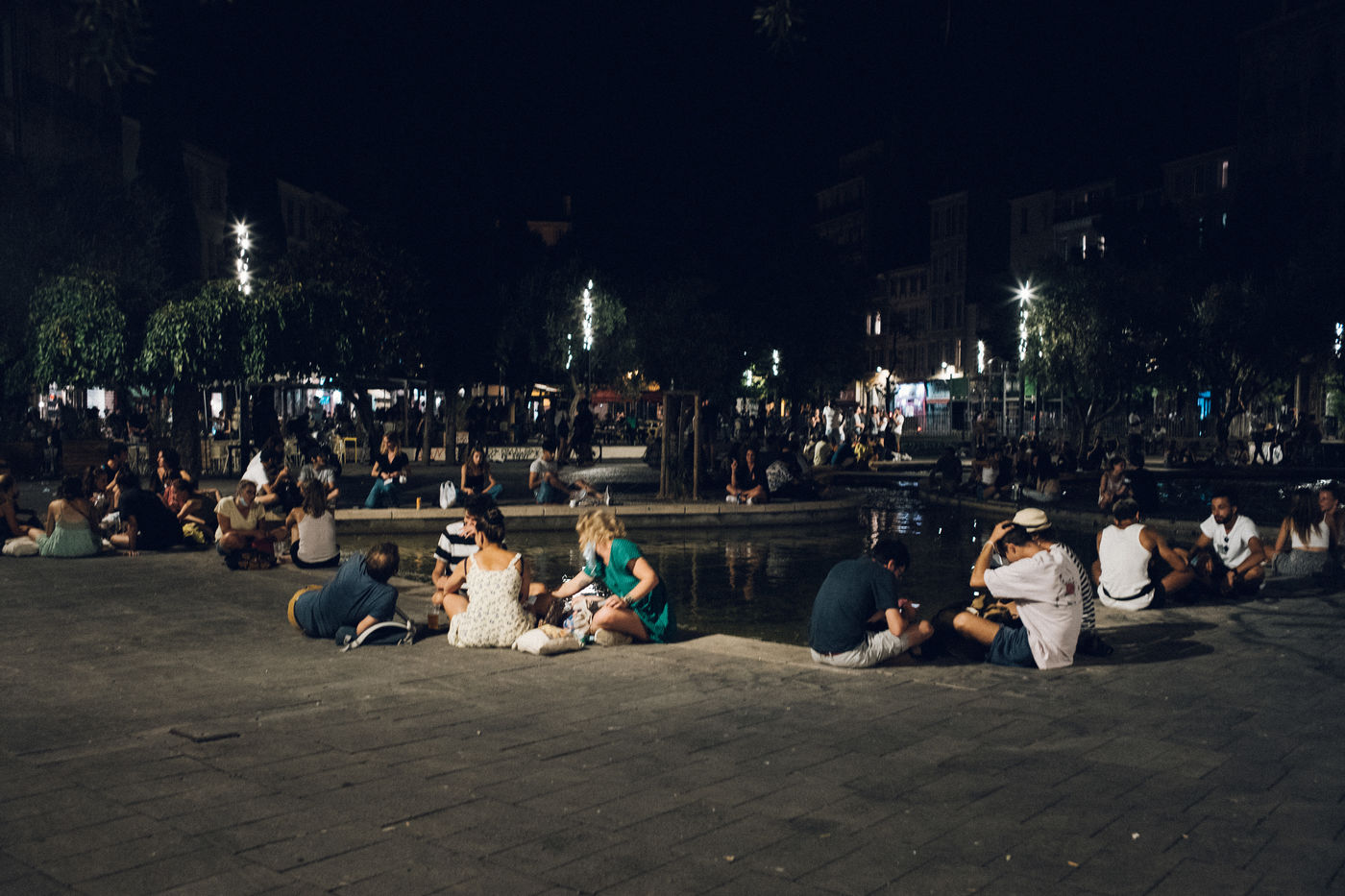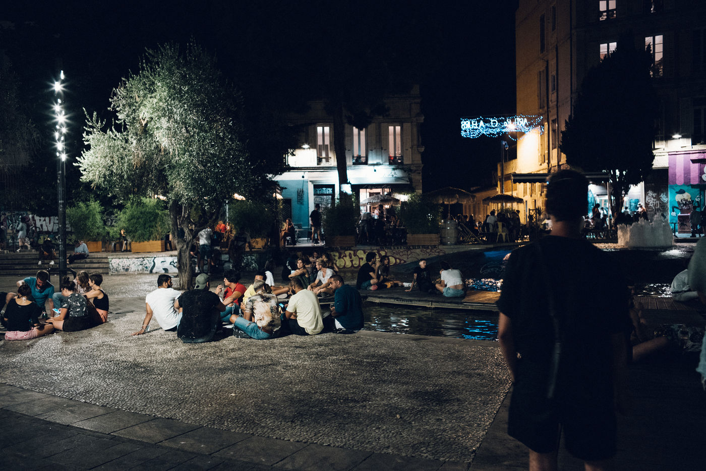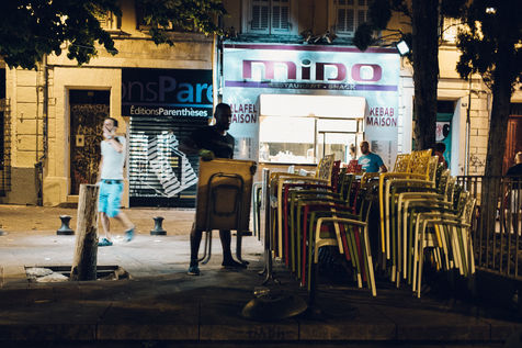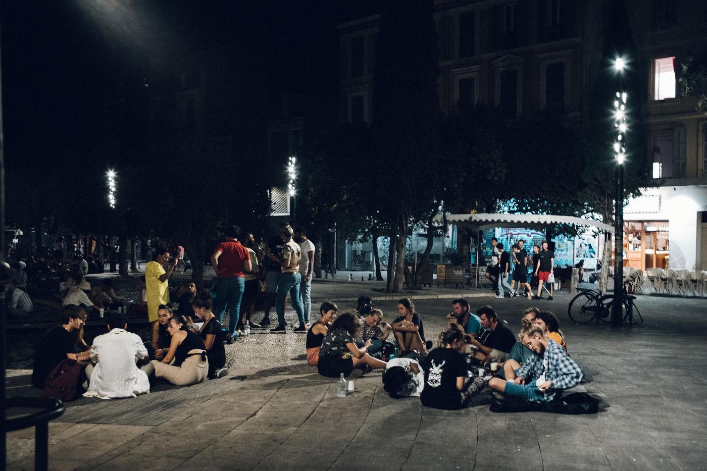 Suite à l'annonce du prefet les bars et restaurants doivent fermer leurs portes dès 23h. Inquiets ou résignés, les clients ont souvent quitté les terrasses dans le calme, et certains se sont installés à même le sol, tout à côté. Illustration sur le Cours Julien haut lieu des restaurants et bar à Marseille. Reportage réalisé pour Le Monde.
