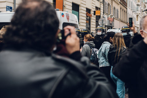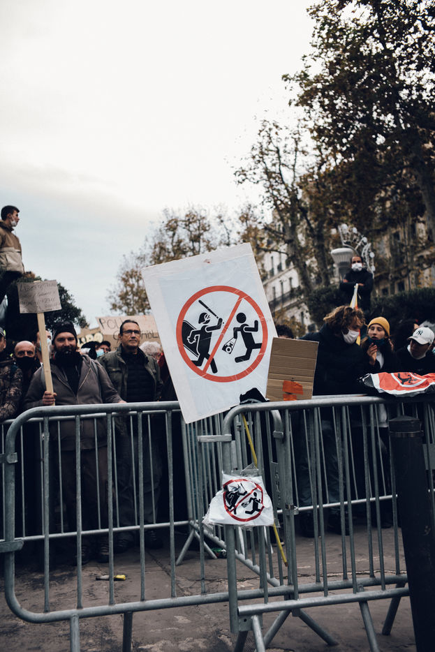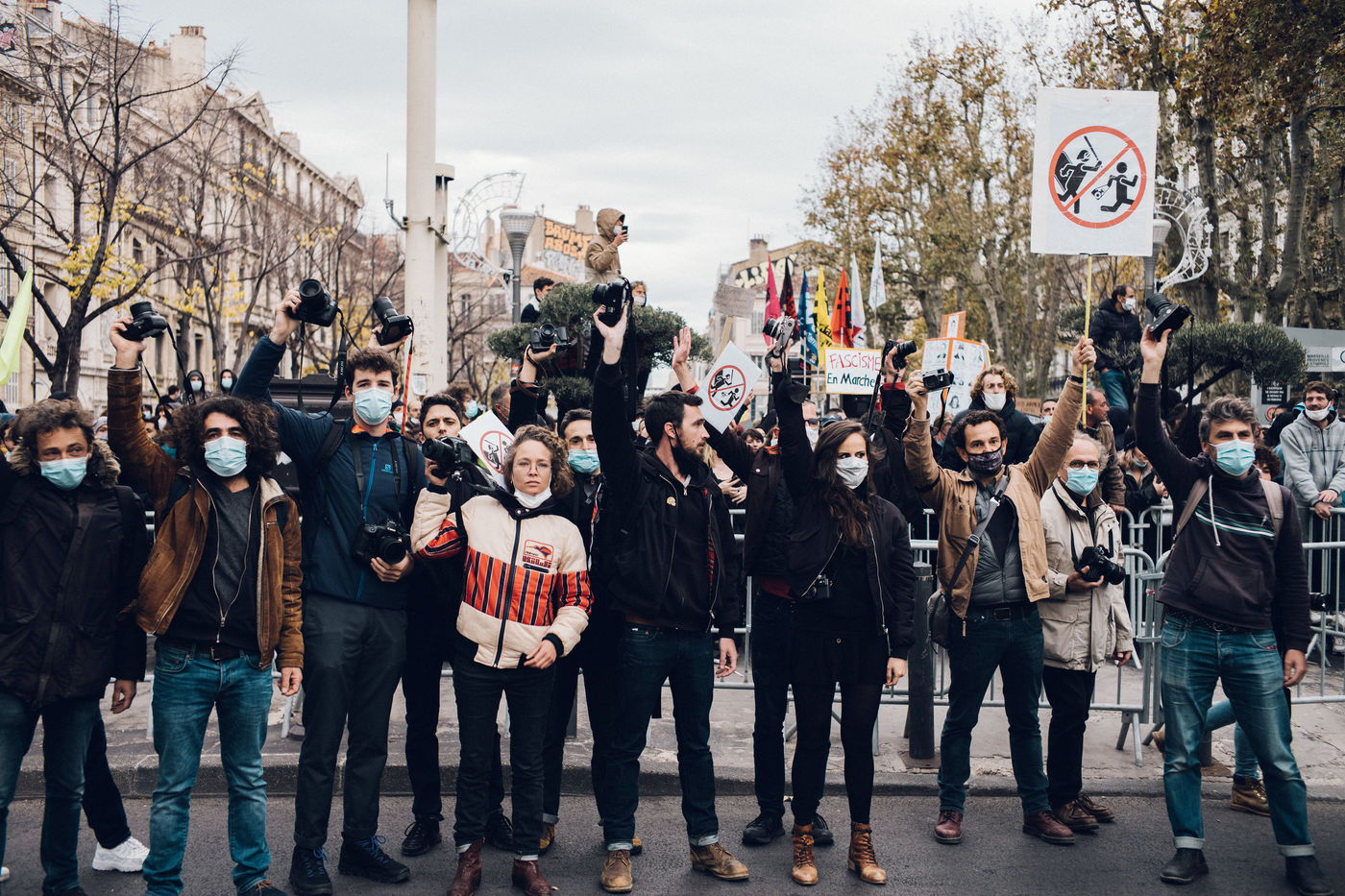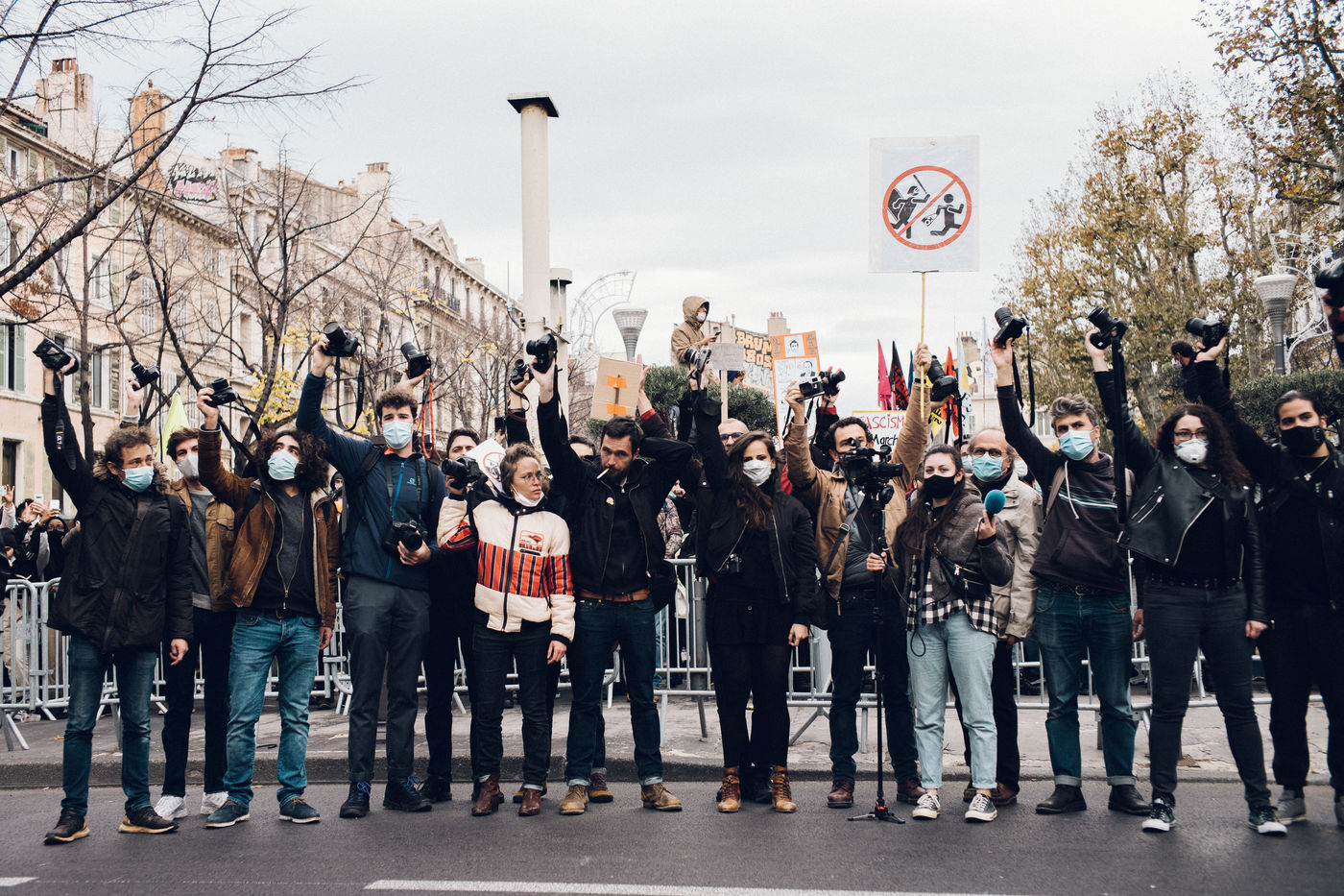 28 November 2020, Marseille, France. Gathering in Marseille for the March of Liberties, citizens and journalists to protest against police violence and the Global Security Law.