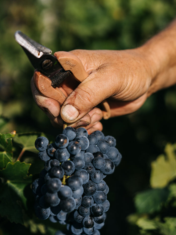 Dans le bordelais, les vendanges à la main se font de plus en plus rares au profit de machines de récolte plus performantes. Un vigneron qui produit une AOC Médoc cru Bourgeois, choisit lui de garder l'esprit familial en embauchant d'une année sur l'autre les volontaires souhaitant participer à cette tradition des vendanges. France, septembre 2020. Photo par Tom Grimbert / Hans Lucas